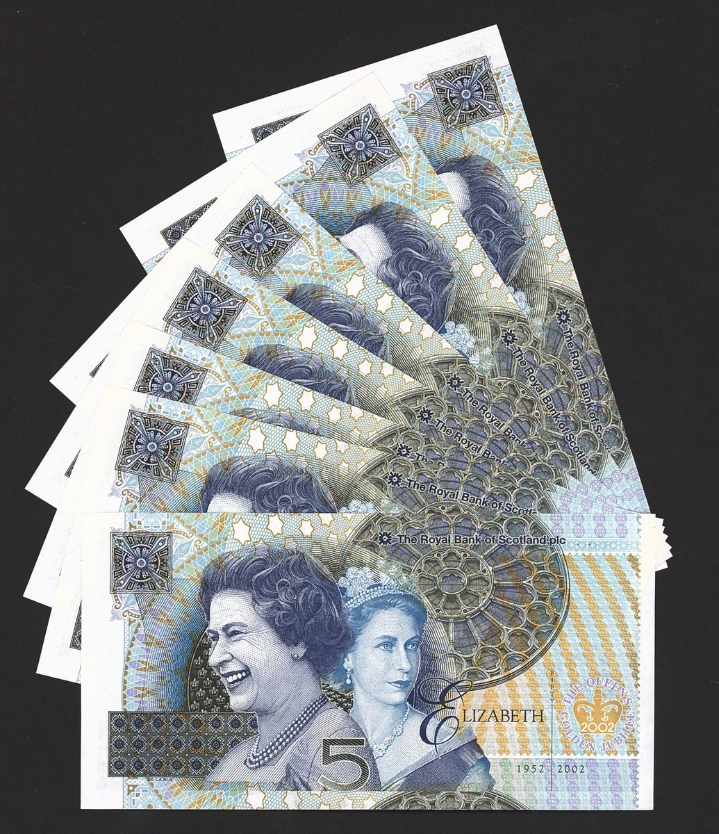 Royal Bank of Scotland, £5, 6 February 2002, serial number TQGJ0001902-03, 1905-09 Lord Ilay First Governor of the Royal Bank of Scotland at right, reverse, portraits of the Queen, showing her at the time of her Coronation and more recently. This note was issued to celebrate 50 years (Golden Jubilee) of the reign of Her Majesty Queen Elizabeth II