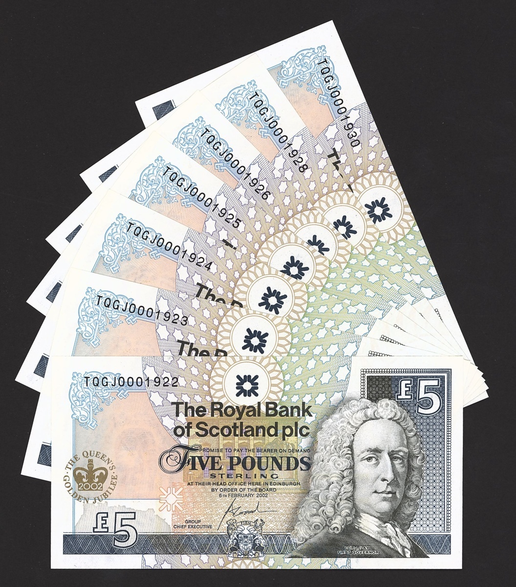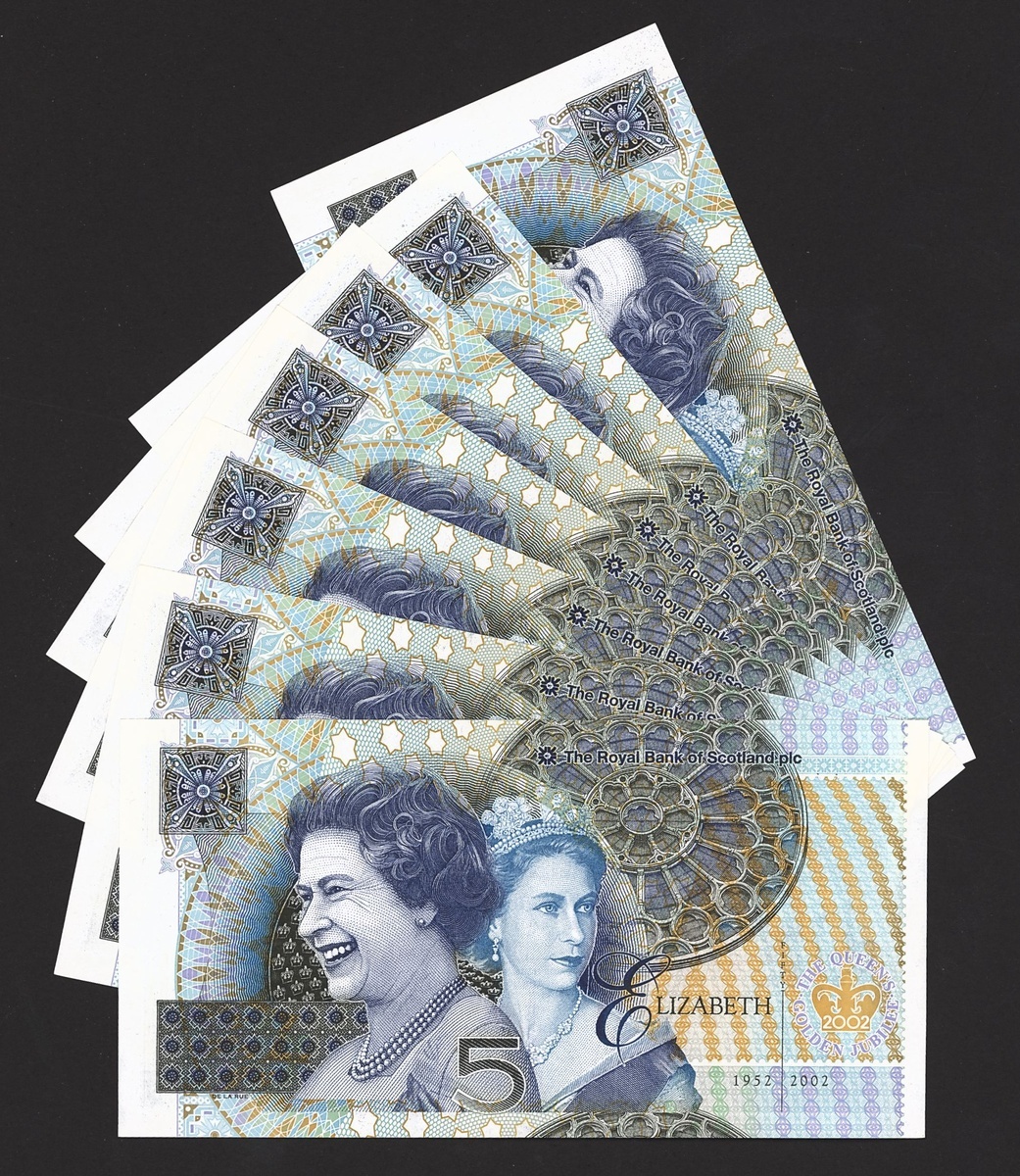 Royal Bank of Scotland, £5, 6 February 2002, serial number TQGJ0001922-26, 1928, 1930, Lord Ilay First Governor of the Royal Bank of Scotland at right, reverse, portraits of the Queen, showing her at the time of her Coronation and more recently. This note was issued to celebrate 50 years (Golden Jubilee) of the reign of Her Majesty Queen Elizabeth II