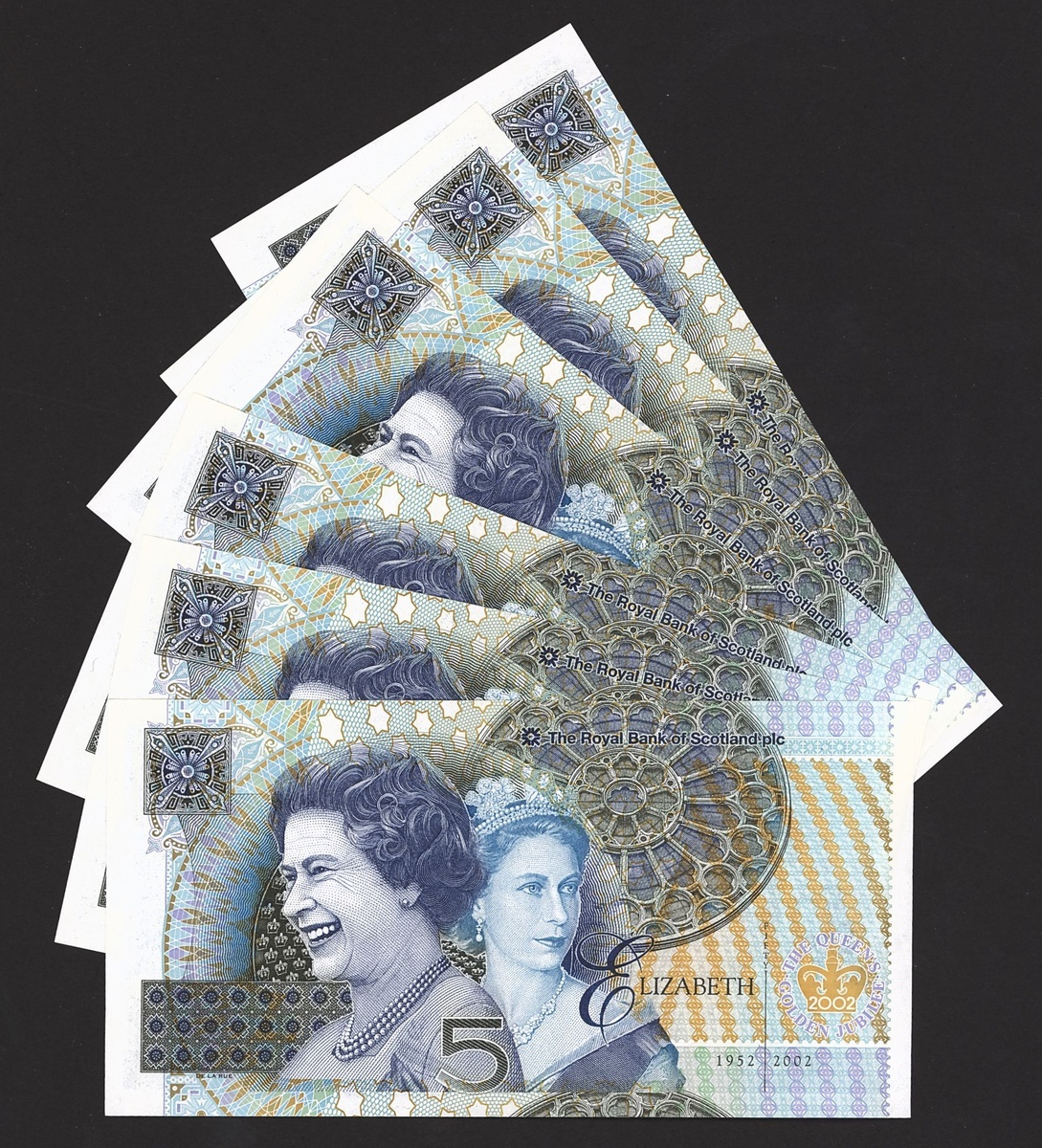 Royal Bank of Scotland, £5, 6 February 2002, serial number TQGJ0001941-44, 1947, 1950, Lord Ilay First Governor of the Royal Bank of Scotland at right, reverse, portraits of the Queen, showing her at the time of her Coronation and more recently. This note was issued to celebrate 50 years (Golden Jubilee) of the reign of Her Majesty Queen Elizabeth II