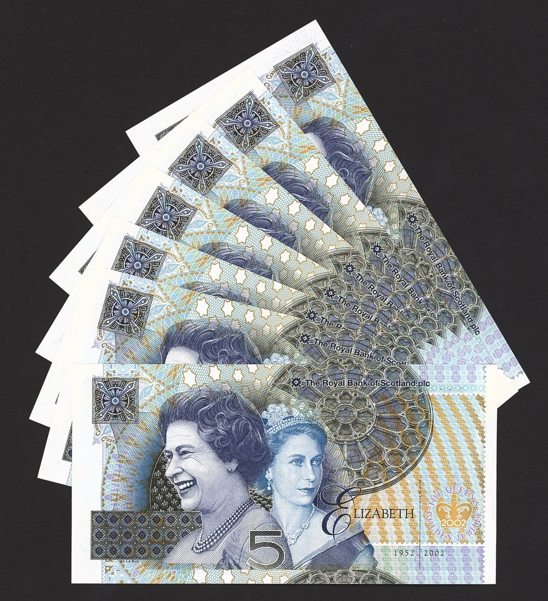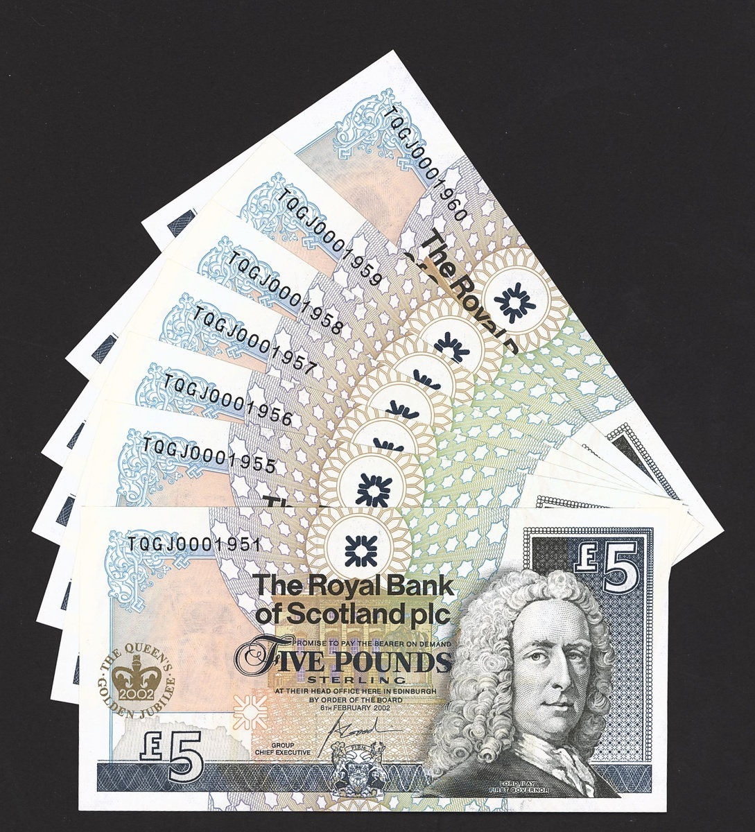 Royal Bank of Scotland, £5, 6 February 2002, serial number TQGJ0001951, 1955-60, Lord Ilay First Governor of the Royal Bank of Scotland at right, reverse, portraits of the Queen, showing her at the time of her Coronation and more recently. This note was issued to celebrate 50 years (Golden Jubilee) of the reign of Her Majesty Queen Elizabeth II