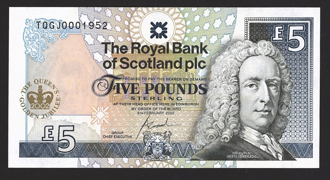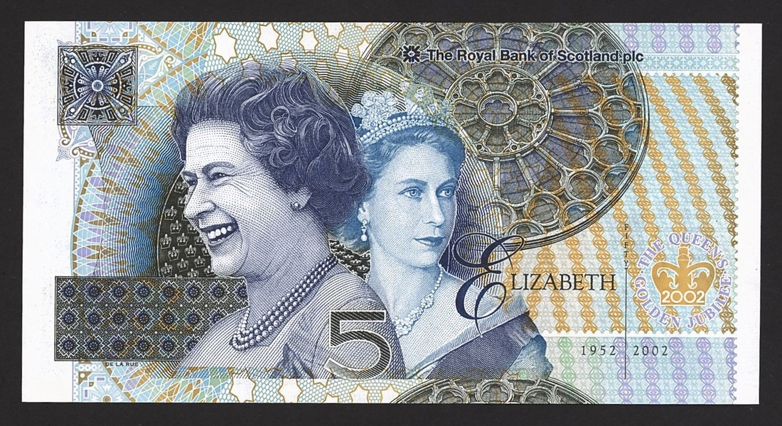 Royal Bank of Scotland, £5, 6 February 2002, serial number TQGJ0001952, Lord Ilay First Governor of the Royal Bank of Scotland at right, reverse, portraits of the Queen, showing her at the time of her Coronation and more recently. This note was issued to celebrate 50 years (Golden Jubilee) of the reign of Her Majesty Queen Elizabeth II