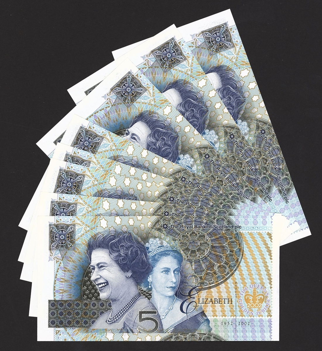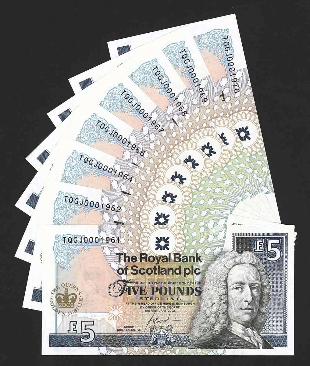 Royal Bank of Scotland, £5, 6 February 2002, serial number TQGJ0001961-62, 1964, 1966-70, Lord Ilay First Governor of the Royal Bank of Scotland at right, reverse, portraits of the Queen, showing her at the time of her Coronation and more recently. This note was issued to celebrate 50 years (Golden Jubilee) of the reign of Her Majesty Queen Elizabeth II