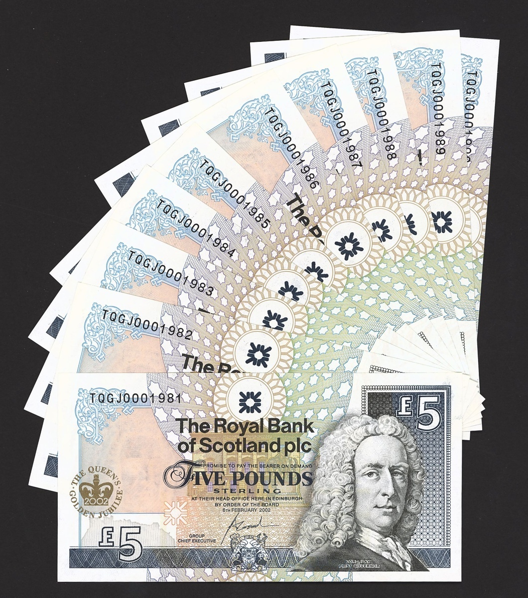 Royal Bank of Scotland, £5, 6 February 2002, serial number TQGJ0001981-90, Lord Ilay First Governor of the Royal Bank of Scotland at right, reverse, portraits of the Queen, showing her at the time of her Coronation and more recently. This note was issued to celebrate 50 years (Golden Jubilee) of the reign of Her Majesty Queen Elizabeth II