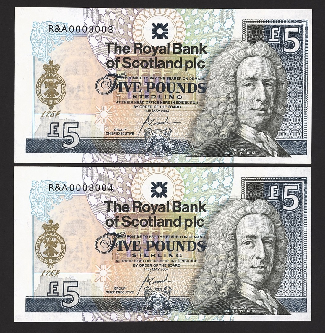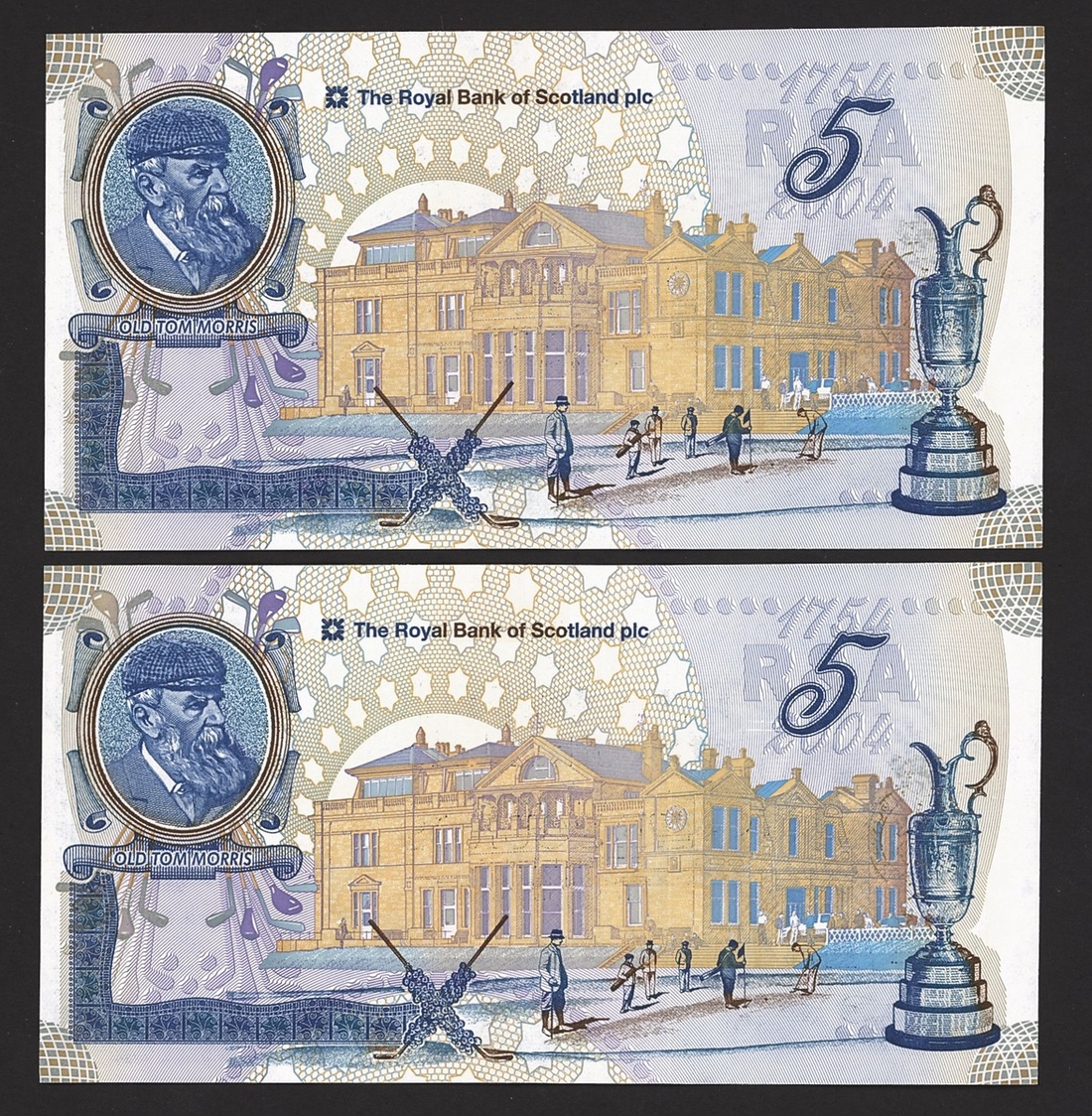 Royal Bank of Scotland, £5, 14 May 2004, serial number R&A0003003/4, Lord Ilay First Governor of the Royal Bank of Scotland at right, reverse, portrait of the golf pioneer Old Tom Morris, Royal and Ancient Golf Club of St Andrews. This note celebrated the world-famous Royal and Ancient Golf Club of St Andrews and, more generally, Scotland's proud history as the home of golf.