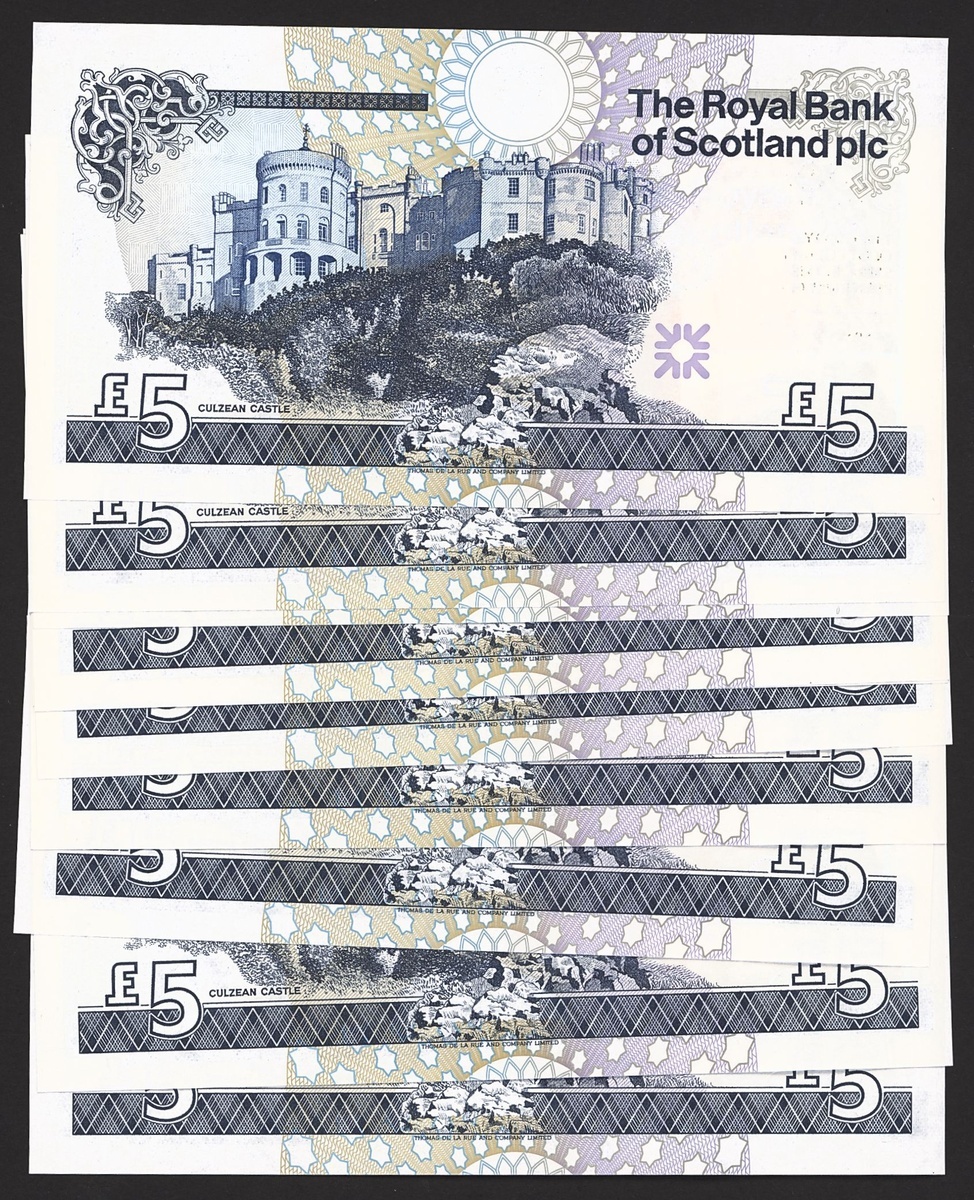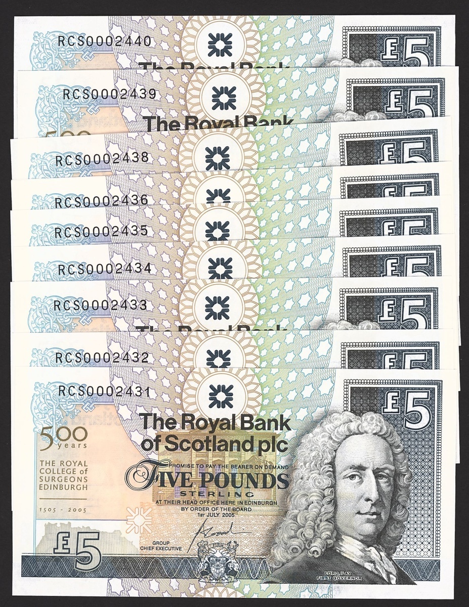 Royal Bank of Scotland, £5, 1 July 2005, serial number RCS0002431-40, Lord Ilay First Governor of the Royal Bank of Scotland at right, reverse, Culzean Castle. This note marked the 500th anniversary of The Royal College of Surgeons of Edinburgh, the oldest incorporated medical organisation in the world. Prefix RCS, standing for Royal College of Surgeons
