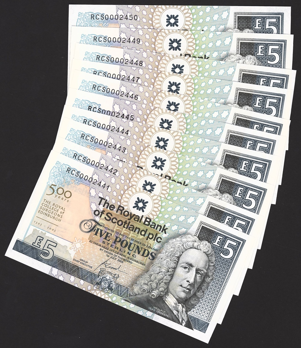 Royal Bank of Scotland, £5, 1 July 2005, serial number RCS0002441-50, Lord Ilay First Governor of the Royal Bank of Scotland at right, reverse, Culzean Castle. This note marked the 500th anniversary of The Royal College of Surgeons of Edinburgh, the oldest incorporated medical organisation in the world. Prefix RCS, standing for Royal College of Surgeons