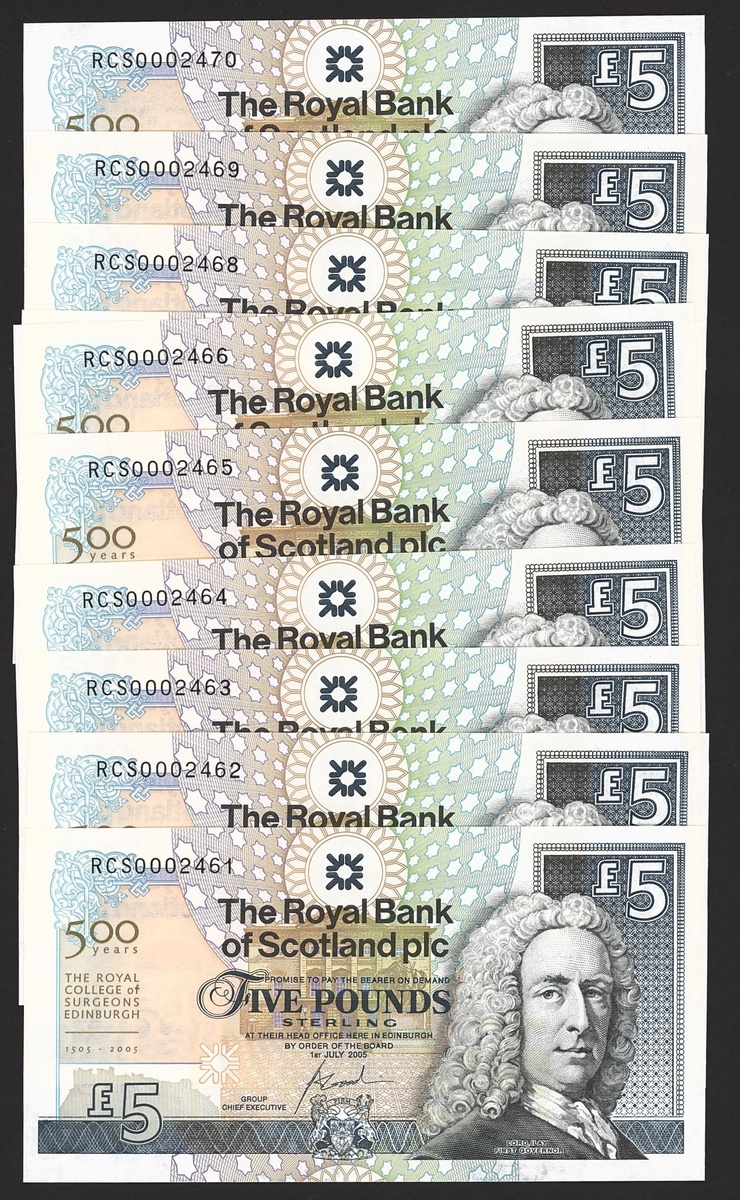 Royal Bank of Scotland, £5, 1 July 2005, serial number RCS0002461-70, Lord Ilay First Governor of the Royal Bank of Scotland at right, reverse, Culzean Castle. This note marked the 500th anniversary of The Royal College of Surgeons of Edinburgh, the oldest incorporated medical organisation in the world. Prefix RCS, standing for Royal College of Surgeons