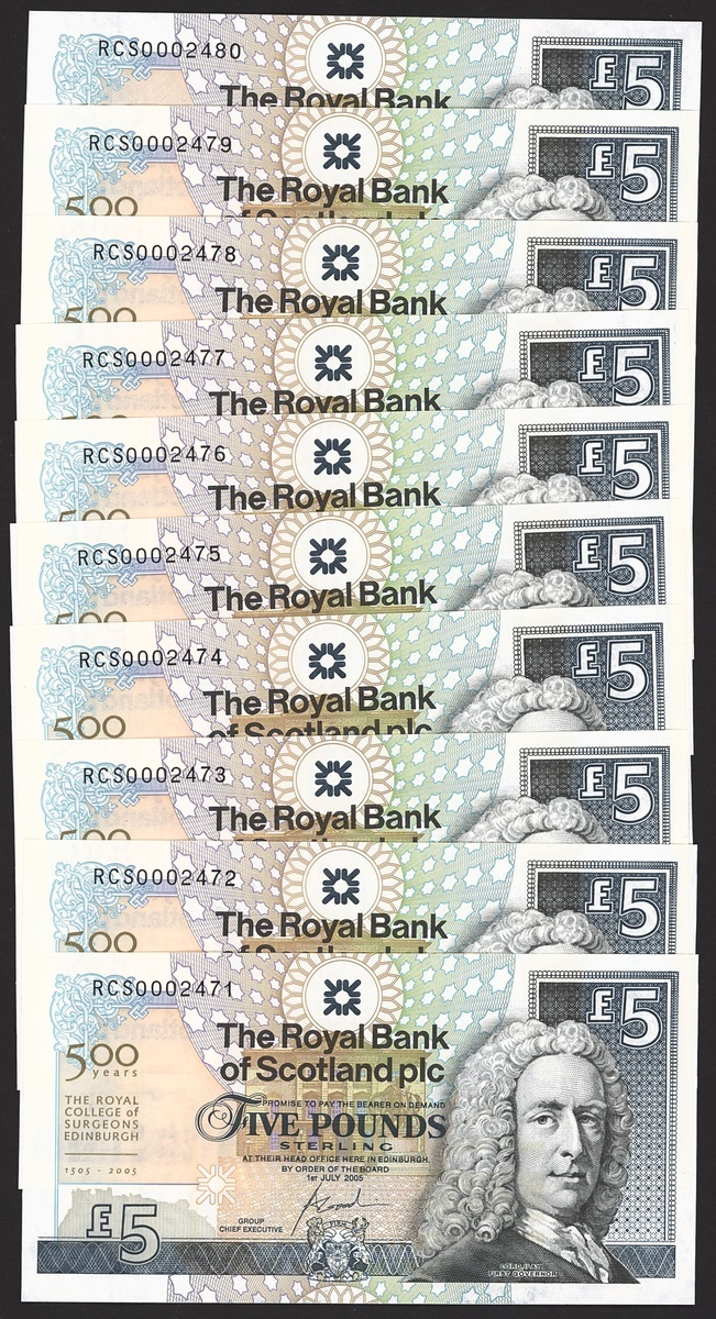 Royal Bank of Scotland, £5, 1 July 2005, serial number RCS0002471-80, Lord Ilay First Governor of the Royal Bank of Scotland at right, reverse, Culzean Castle. This note marked the 500th anniversary of The Royal College of Surgeons of Edinburgh, the oldest incorporated medical organisation in the world. Prefix RCS, standing for Royal College of Surgeons