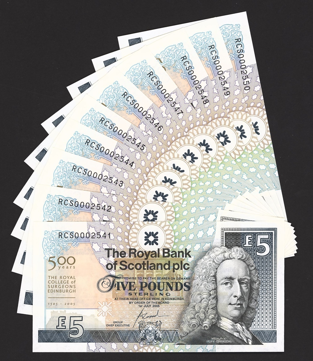 Royal Bank of Scotland, £5, 1 July 2005, serial number RCS0002541-50, Lord Ilay First Governor of the Royal Bank of Scotland at right, reverse, Culzean Castle. This note marked the 500th anniversary of The Royal College of Surgeons of Edinburgh, the oldest incorporated medical organisation in the world. Prefix RCS, standing for Royal College of Surgeons