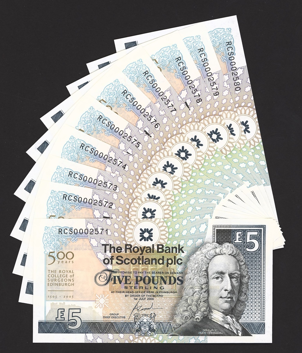 Royal Bank of Scotland, £5, 1 July 2005, serial number RCS0002571-80, Lord Ilay First Governor of the Royal Bank of Scotland at right, reverse, Culzean Castle. This note marked the 500th anniversary of The Royal College of Surgeons of Edinburgh, the oldest incorporated medical organisation in the world. Prefix RCS, standing for Royal College of Surgeons