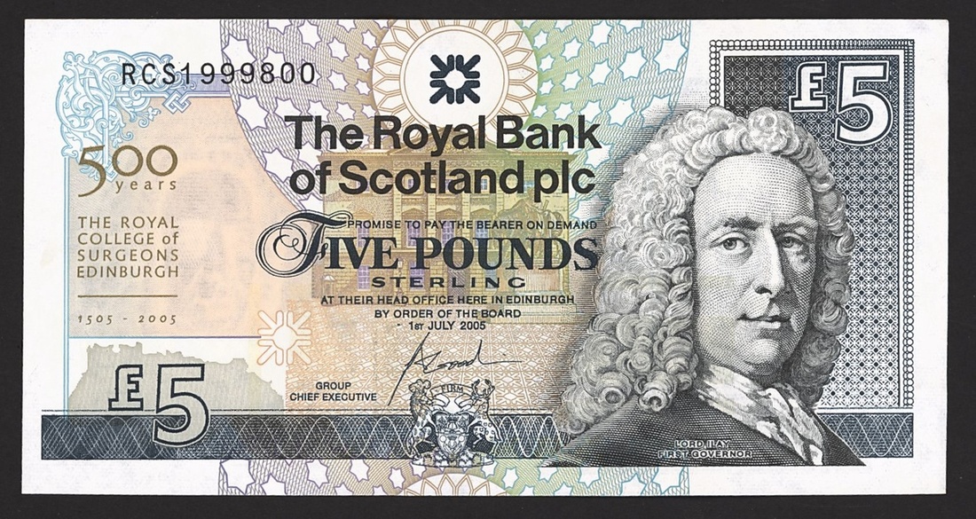 Royal Bank of Scotland, £5, 1 July 2005, serial number RCS1999800, Lord Ilay First Governor of the Royal Bank of Scotland at right, reverse, Culzean Castle. This note marked the 500th anniversary of The Royal College of Surgeons of Edinburgh, the oldest incorporated medical organisation in the world. Prefix RCS, standing for Royal College of Surgeons