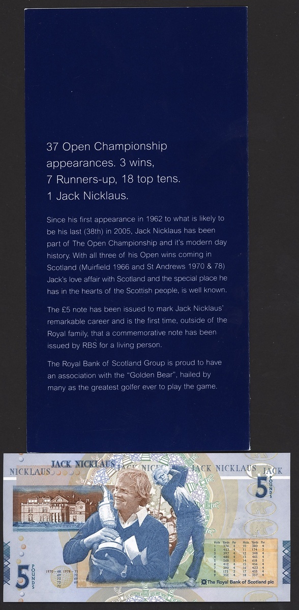 Royal Bank of Scotland, £5, 14 July 2005, serial number JWN0678477, Lord Ilay First Governor of the Royal Bank of Scotland at right, reverse, Nicklaus holding the Claret Jug and playing a shot on his way to victory in 1978. This note was issued on 14 July 2005, the first day of the 2005 Open Golf Championship at St Andrews, and celebrated the remarkable career of Jack Nicklaus, who won the Open three times, including twice at St Andrews
