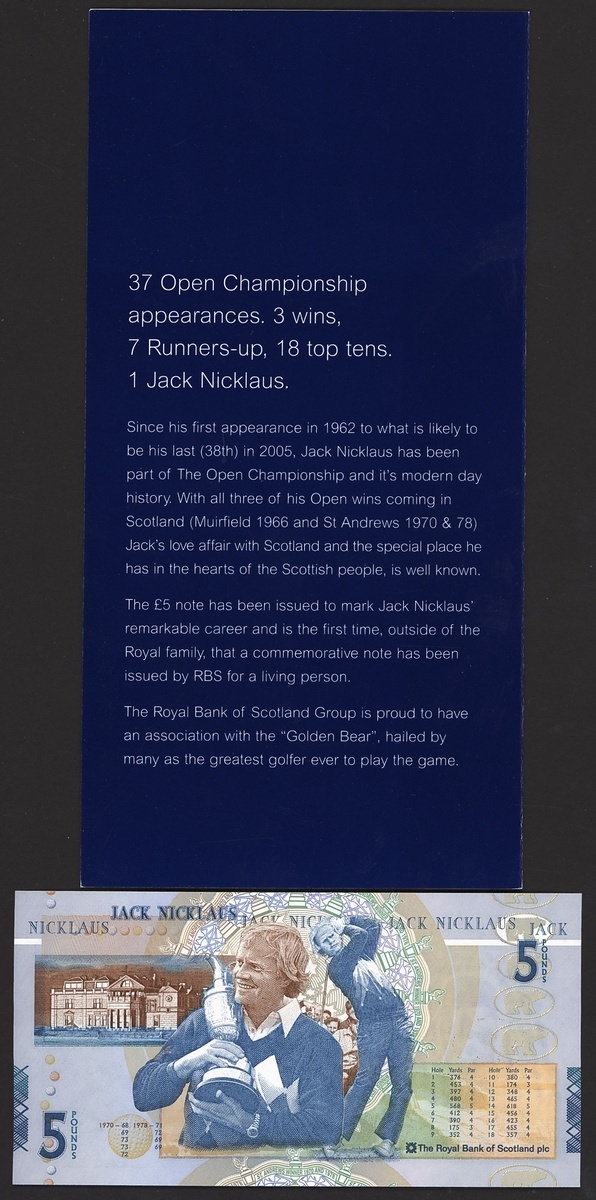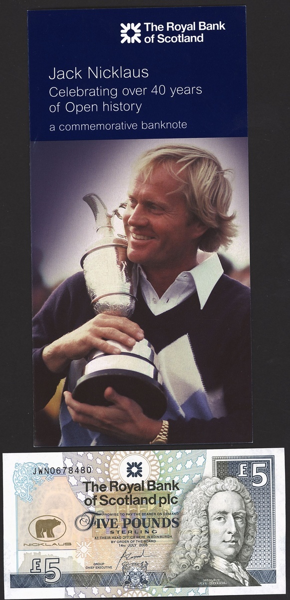 Royal Bank of Scotland, £5, 14 July 2005, serial number JWN0678480, Lord Ilay First Governor of the Royal Bank of Scotland at right, reverse, Nicklaus holding the Claret Jug and playing a shot on his way to victory in 1978