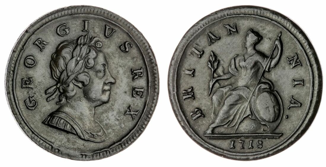 The 'Haddenham' Collection of English Coins | George I (1714-1727), Copper Halfpenny (3), 'Dump' issue, 1717, 1717 No stops on obverse, 1718, legend continuous over bust right, rev. britan-nia., Britannia seated left, date in exergue, plain edge, 8.97g, 9.44g, 9.34g 6h (Peck 768, 769, 774; Spink 3659), the first has a scratch across the bust and some rim dings, dark toning, very fine; the second appears to have a striking flaw to rim above REX, also struck slightly off centre, rubbed to high points, however lightly toned, fine; rubbed to high points, otherwise deep chocolate toning, very fine (3)