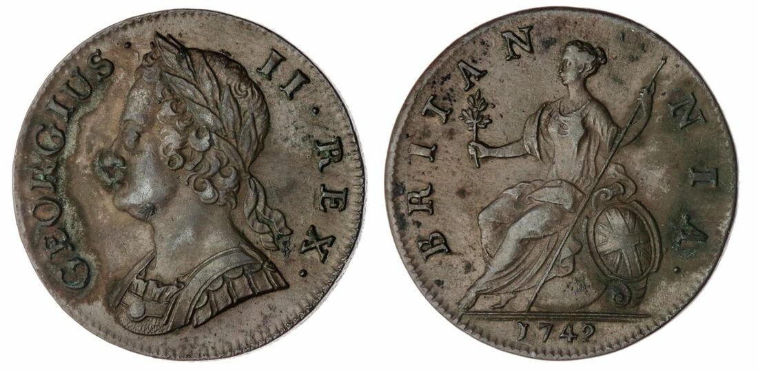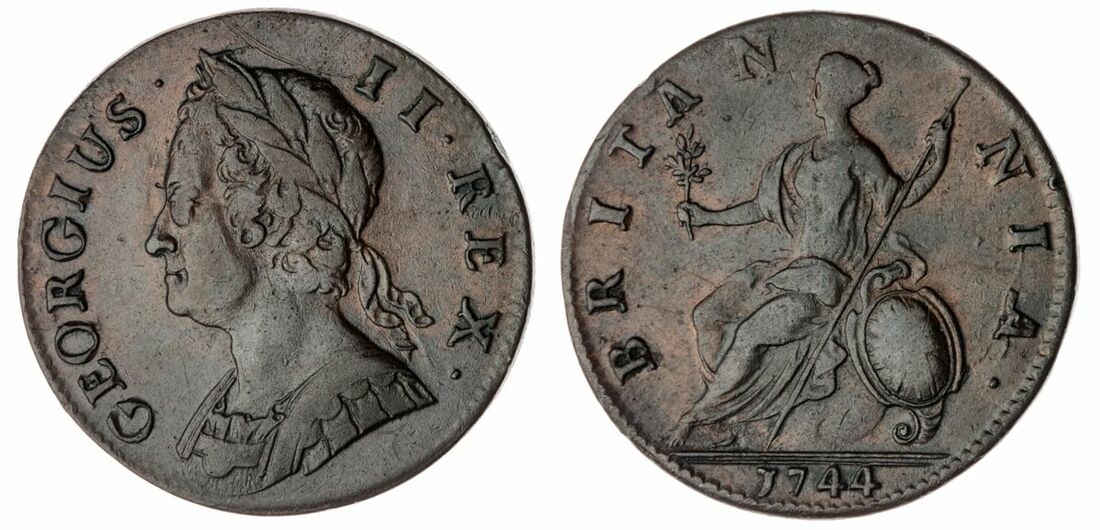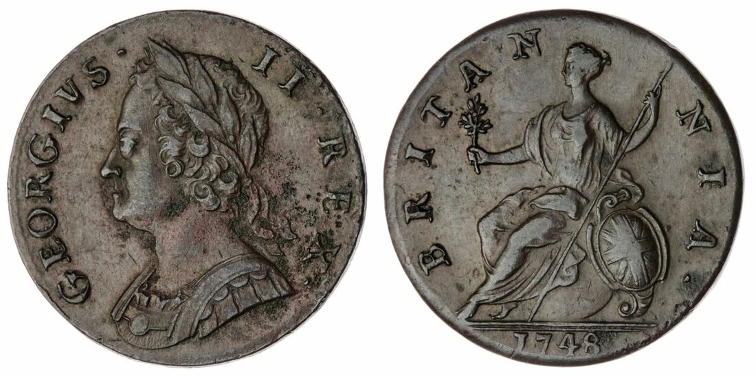 The 'Haddenham' Collection of English Coins | George II (1727-1760), Copper Halfpenny (6), 1740, 1742, 1743, 1744, 1746, 1748, old laureate and cuirassed bust left, rev. britan-nia., Britannia seated left, date in exergue, plain edge, 9.82g, 10.30g, 9.79g, 9.52g, 9.56g, 9.37g, 6h (Peck 870, 872, 873, 874, 876, 878; Spink 3719), all with varying degrees of rubbing to high points but mostly light, nicely toned, very fine to good very fine (6)