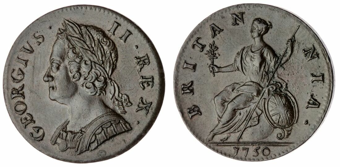 The 'Haddenham' Collection of English Coins | George II (1727-1760), (2) Copper Halfpennies, 1750, old laureate and cuirassed bust left, rev. BRITAN-NIA., Britannia seated left, date in exergue, plain edge, 10.06g, 6h (Peck 880; Spink 3719), some light album friction to bust, otherwise evenly toned and a glossy lustre, extremely fine; and, 1751, 10.01g, 6h (Peck 881; Spink 3719), a few light scratches, superb toning with a glowing lustre, extremely fine (2)