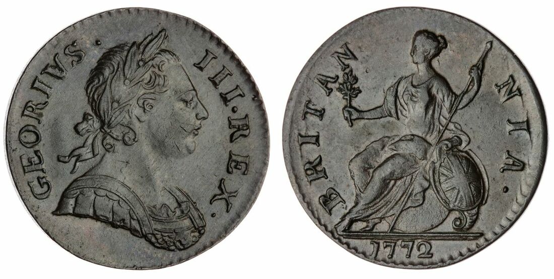 The 'Haddenham' Collection of English Coins | George III (1760-1820), Copper Halfpenny, 1772, 'Georivs' error, laureate and cuirassed bust right, rev.Britannia seated left, date in exergue, plain edge, 10.08g, 6h (Peck 900; Spink 3774), light contact marks, dark glossy toning, extremely fine, rare
