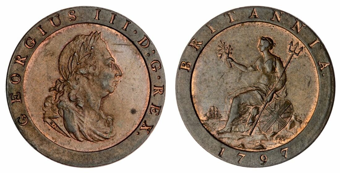 The 'Haddenham' Collection of English Coins | George III (1760-1820), Third Issue, 'Cartwheel' Penny, 1797, Soho, laureate and draped bust facing right, wreath of 11 leaves, K.: on shoulder, rev. Britannia seated to left, .: raised on rock, 29.01g, 5h (BMC [Peck] 1133A [vis. KP22]; Spink 3777), toned good very fine, rare