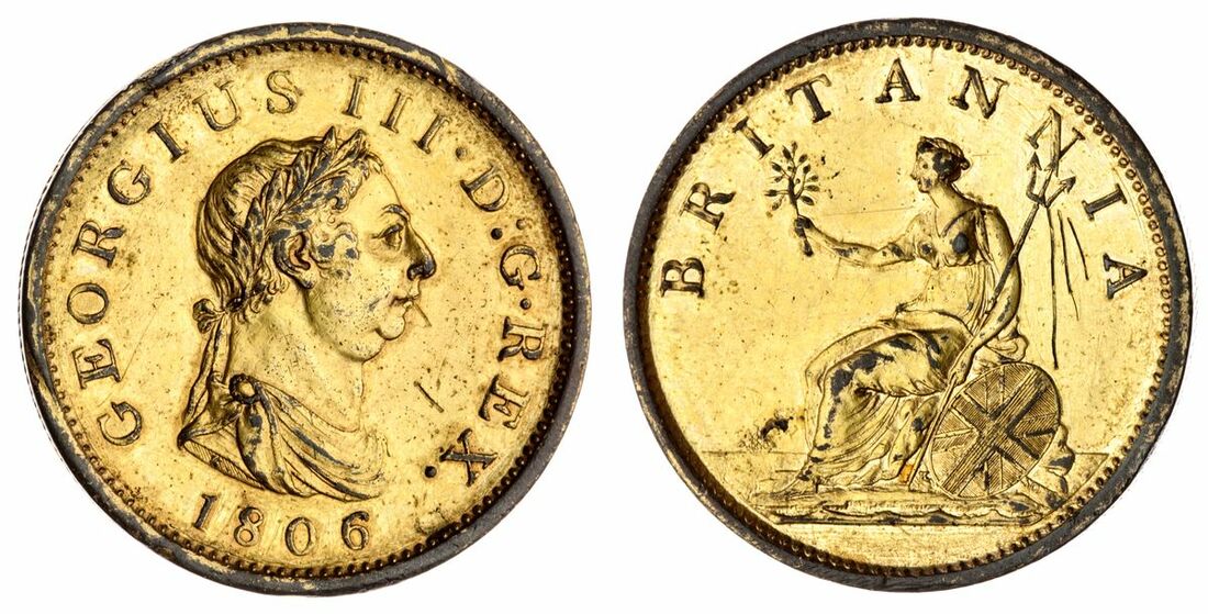 The 'Haddenham' Collection of English Coins | George III (1760-1820), Fourth Issue, Gilt Proof Penny, 1806, Soho, in gilt copper, laureate and draped bust right, rev. Britannia seated left, obliquely milled edge, 18.97g, 6h (BMC [Peck] 1325; Spink 3780), contact marks to high points, otherwise brilliant, very fine