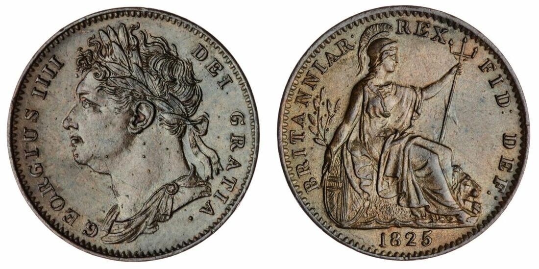 The 'Haddenham' Collection of English Coins | George IV (1820-30), (8) Copper Farthings, First issue, 1821, 1822 leaf ribs incuse, 1822 raised leaf ribs, 1823, 1823 I for 1 in date, 1825, 1825 raised leaf ribs, 1826, laureate and draped bust left, rev. Britannia seated right, plain edge, 4.89g, 4.75g, 4.74g, 4.73g, 4.73g, 4.74g, 4.77g, 4.60g, 6h (Peck 1407, 1409, 1412, 1413, 1415A, 1414, 1416; S.3822), the odd surface scratch, otherwise all with lustre and hints of original colour, extremely fine (8)