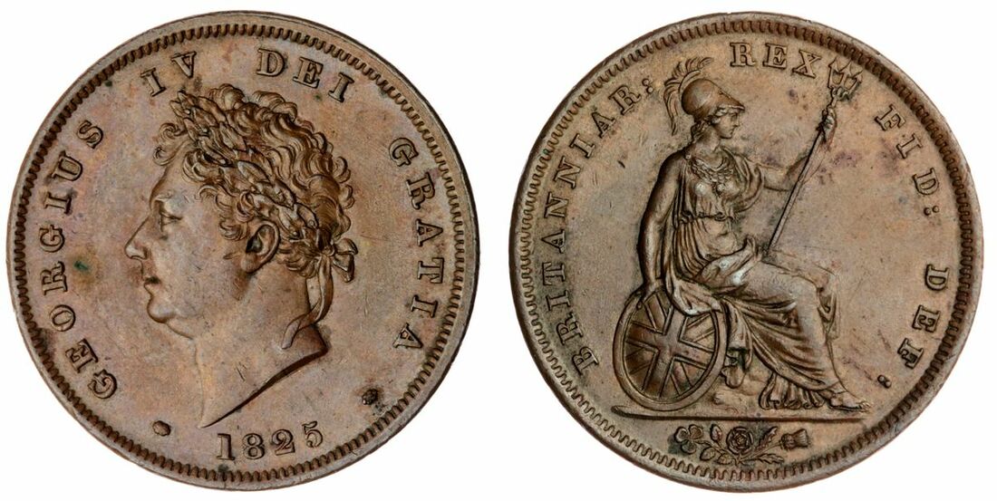The 'Haddenham' Collection of English Coins | George IV (1820-1830), Penny, 1825, laureate head left, rev. Britannia seated right, plain saltire, emblems in exergue, plain edge, 18.71g, 12h (BMC [Peck] 1420; Spink 3823), the odd small surface mark, otherwise nearly extremely fine, scarce