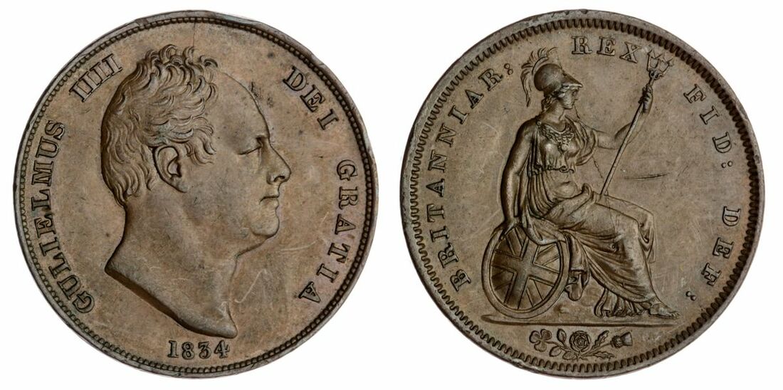 The 'Haddenham' Collection of English Coins | William IV (1830-1837), Penny, 1834, bare head right, rev. Britannia seated right, emblems in exergue, plain edge, 19.00g, 12h (Peck. 1459; Spink 3845), surface scratch in field to right of Britannia, hair details lightly struck, very nearly extremely fine.