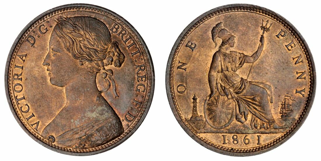 The 'Haddenham' Collection of English Coins | Victoria (1837-1901), Penny, 1861, Obv 5, Rev G, toothed border, 'Bun' head left, rev. Britannia seated right, plain edge, 9.44g, 12h (Freeman 28; Spink 3954), lightly toned over ample original colour, a glorious lustre, very good extremely fine, bordering uncirculated.