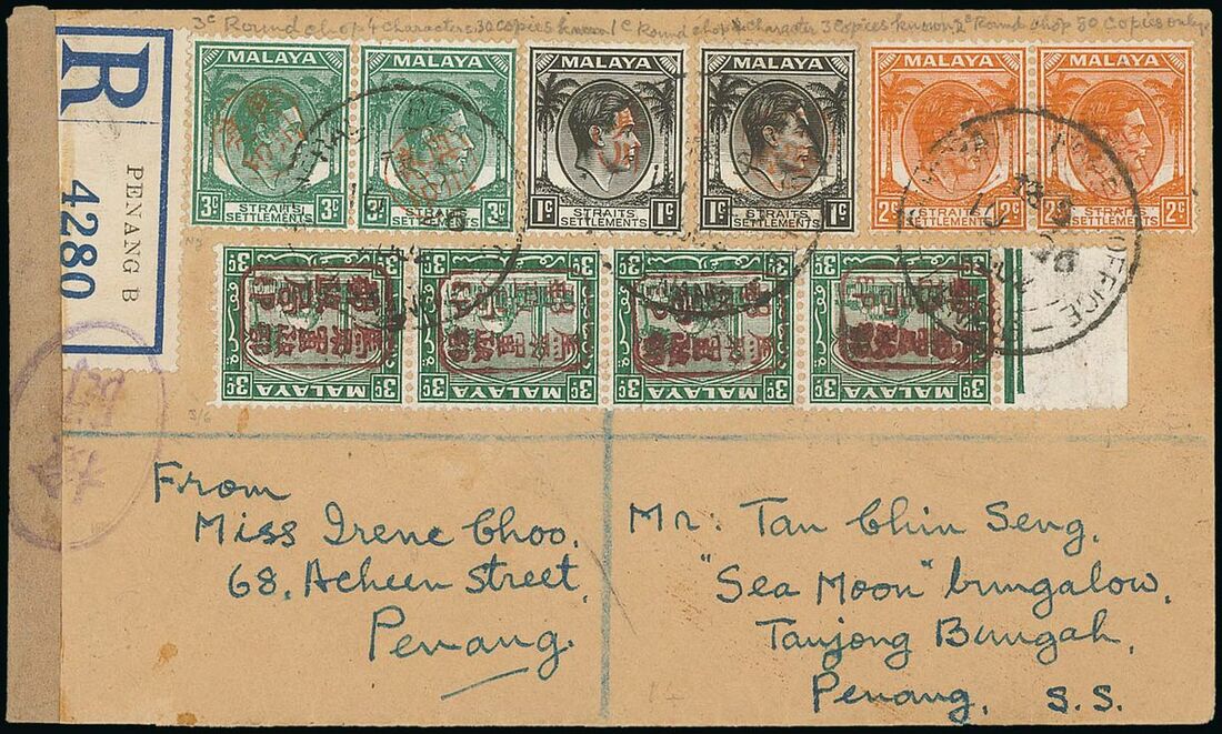 1942 (26 Oct.) locally addressed and registered envelope, bearing Straits Settlements 1c. with Okugawa seal, 1c., 2c. pair and 3c. pair with circular Okugawa revenue seal and Selangor 3c. with sideways single frame chop in brown, all tied by