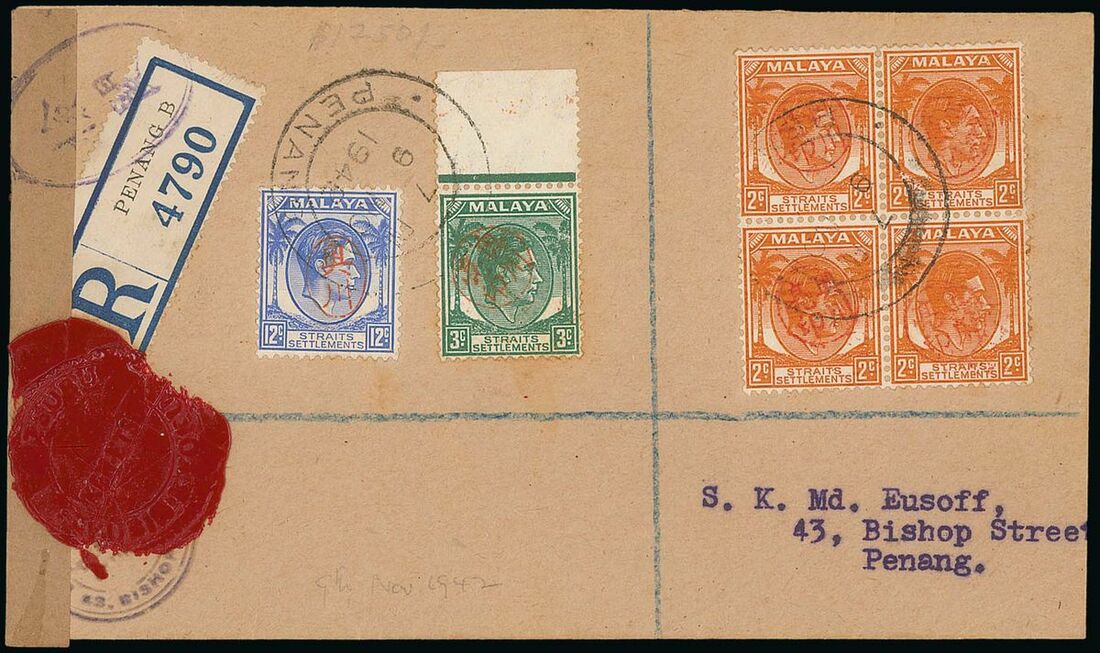 1942 (9 Nov.) locally addressed and registered envelope, bearing Straits Settlements 12c. with Okugawa seal, 2c. block of four and 3c. with circular Okugawa revenue seal, all tied by