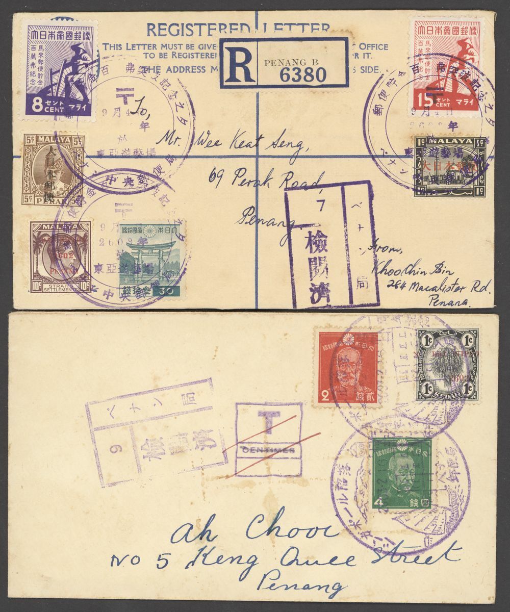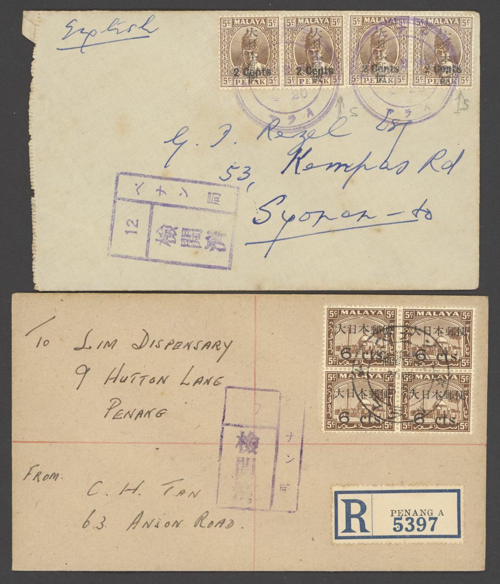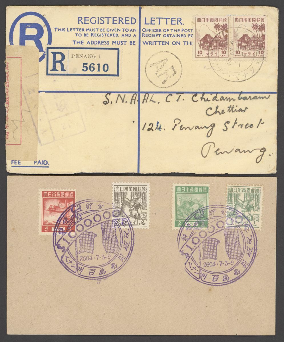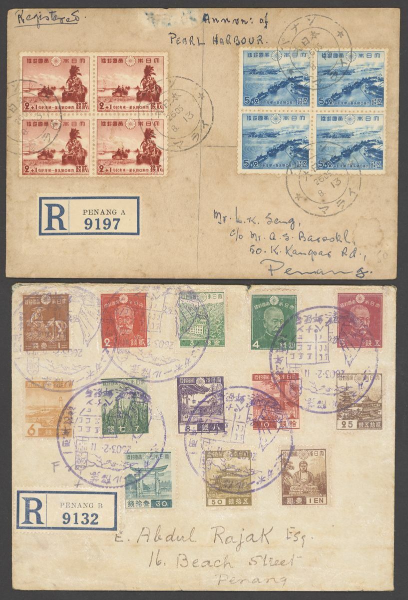1943-45 envelopes (15, eight registered), registered envelopes (3, one Dai Nippon Penang Straits Settlements 15c. size K ), Pictorial 4c. stationery cards (5) and postcards (3), showing a range of frankings, including 1943 (21 Dec.) envelope registered to Singapore, bearing Selangor 12c. with "Kanji" overprint and Pictorial 1c., 2c. and 4c. pair and showing, on reverse, Japanese Serangoon Road arrival c.d.s.; and 1944 (1 Dec.) Perak 15c. registered envelope with "Kanji" overprint, bearing Pictorial 10c. pair and showing