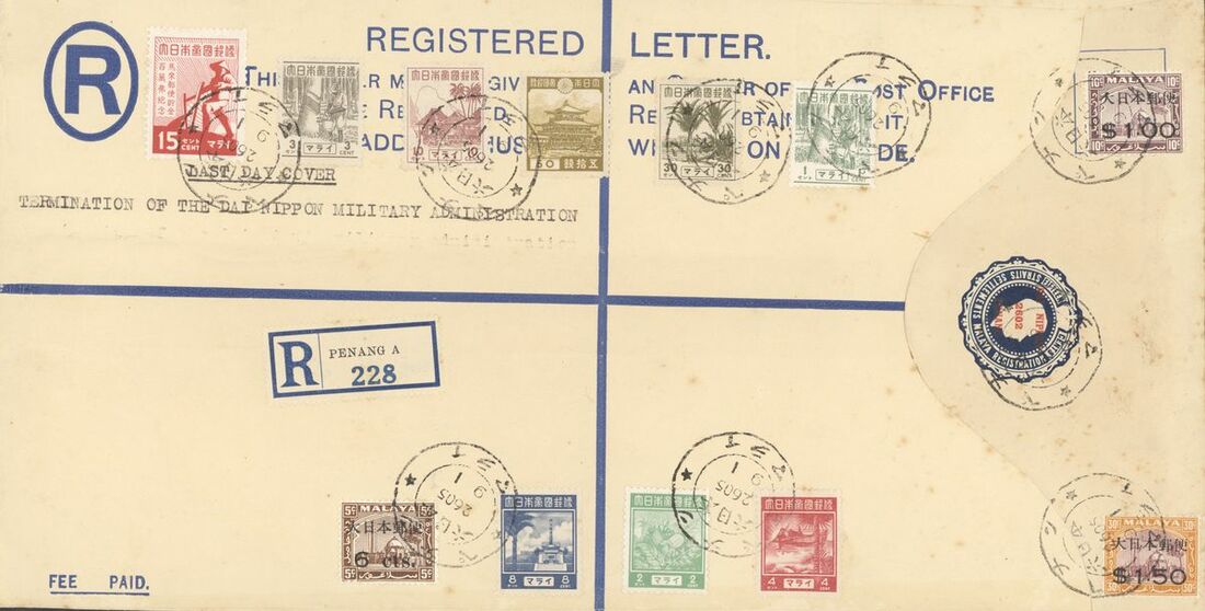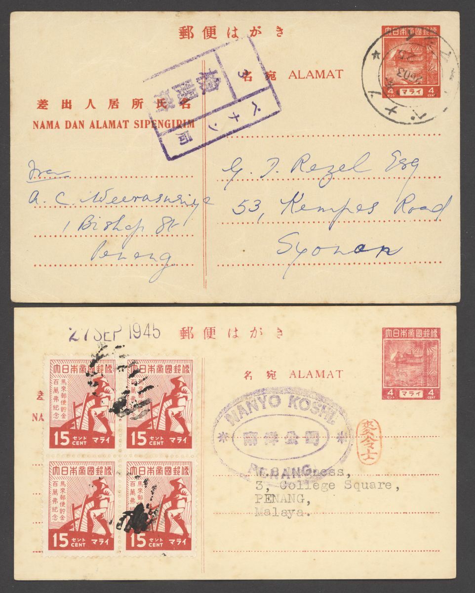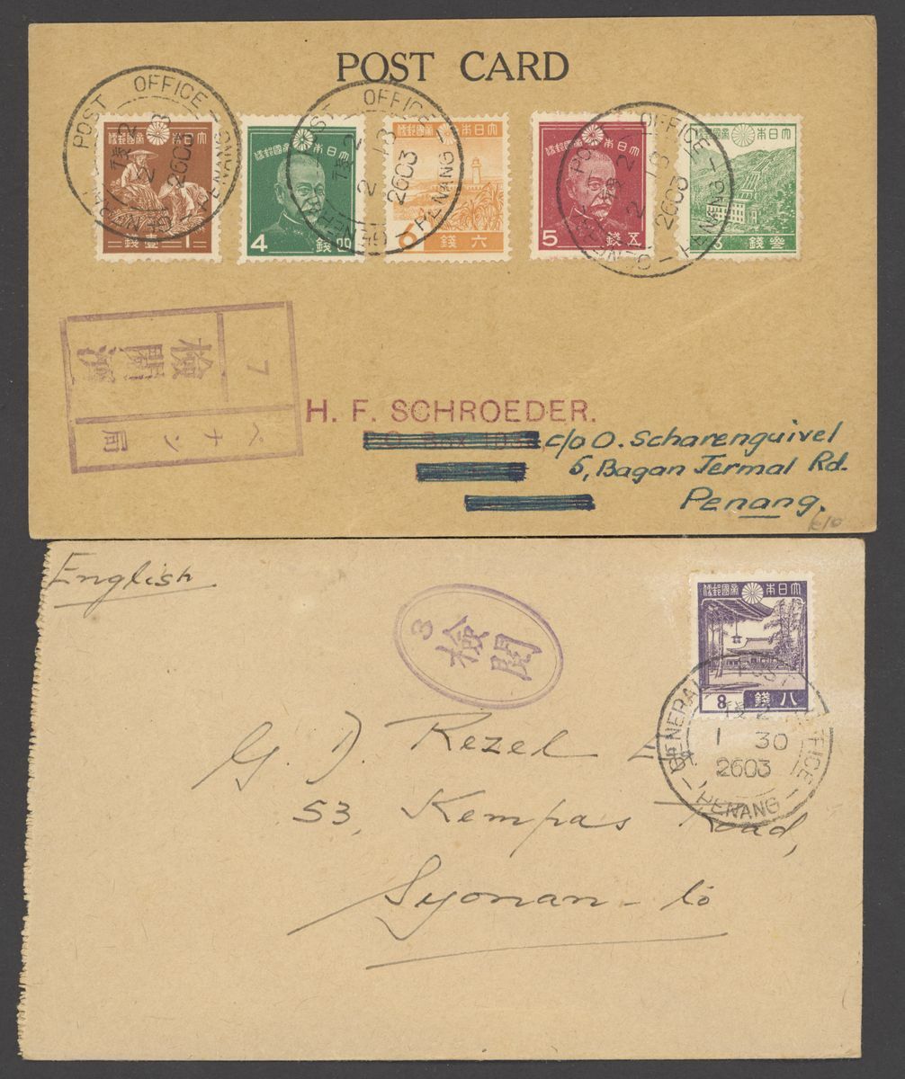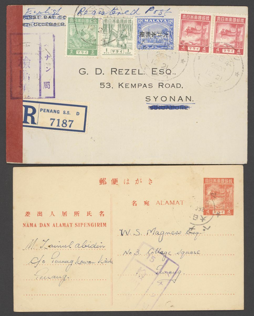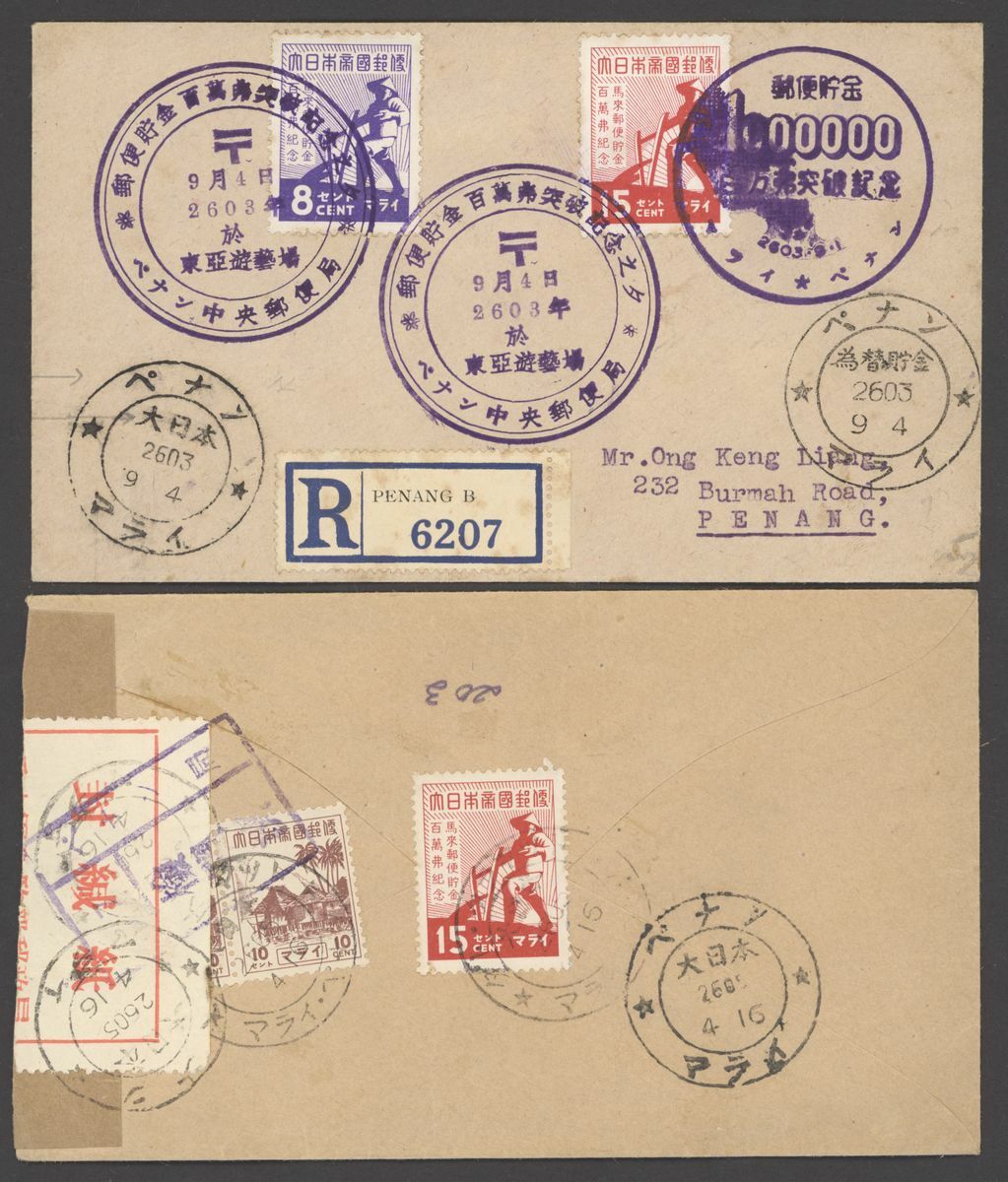 1943-45 envelopes (15, eight registered), registered envelopes (3, one Dai Nippon Penang Straits Settlements 15c. size K ), Pictorial 4c. stationery cards (5) and postcards (3), showing a range of frankings, including 1943 (21 Dec.) envelope registered to Singapore, bearing Selangor 12c. with "Kanji" overprint and Pictorial 1c., 2c. and 4c. pair and showing, on reverse, Japanese Serangoon Road arrival c.d.s.; and 1944 (1 Dec.) Perak 15c. registered envelope with "Kanji" overprint, bearing Pictorial 10c. pair and showing