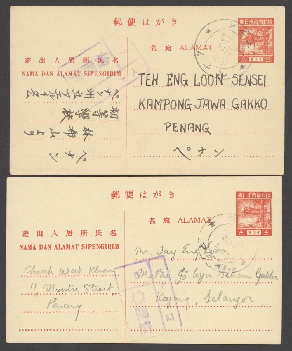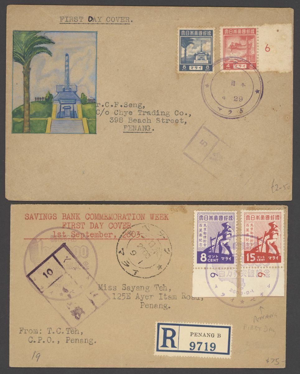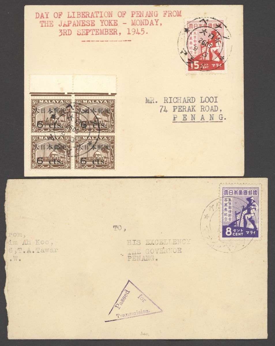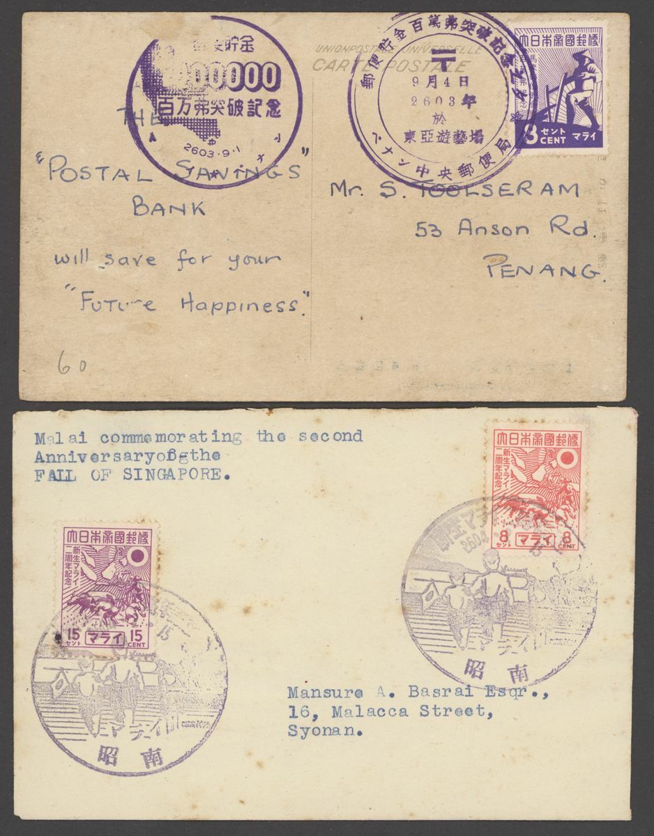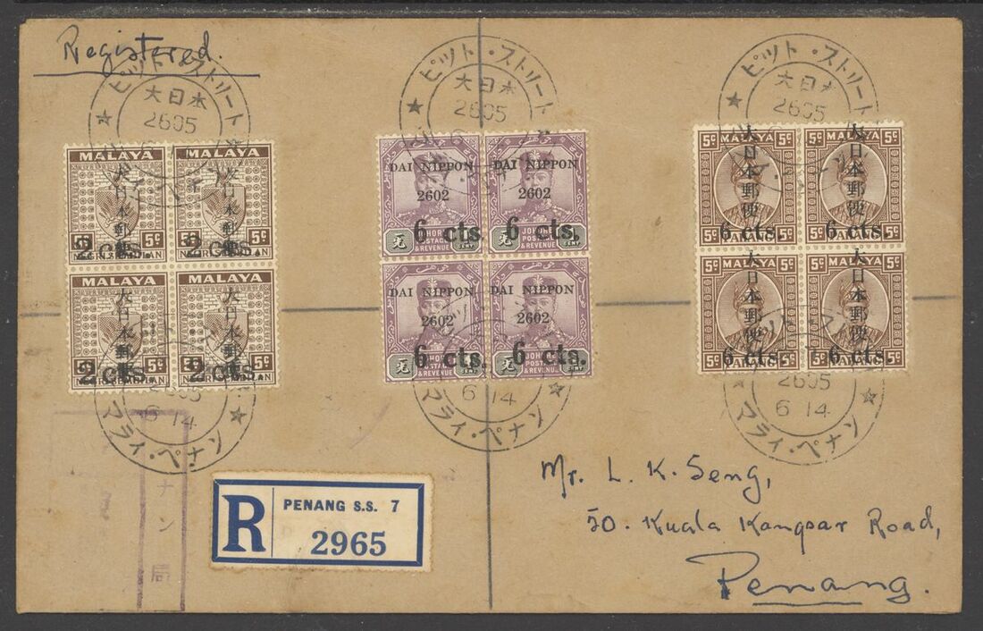 1943-45 envelopes (15, eight registered), registered envelopes (3, one Dai Nippon Penang Straits Settlements 15c. size K ), Pictorial 4c. stationery cards (5) and postcards (3), showing a range of frankings, including 1943 (21 Dec.) envelope registered to Singapore, bearing Selangor 12c. with "Kanji" overprint and Pictorial 1c., 2c. and 4c. pair and showing, on reverse, Japanese Serangoon Road arrival c.d.s.; and 1944 (1 Dec.) Perak 15c. registered envelope with "Kanji" overprint, bearing Pictorial 10c. pair and showing