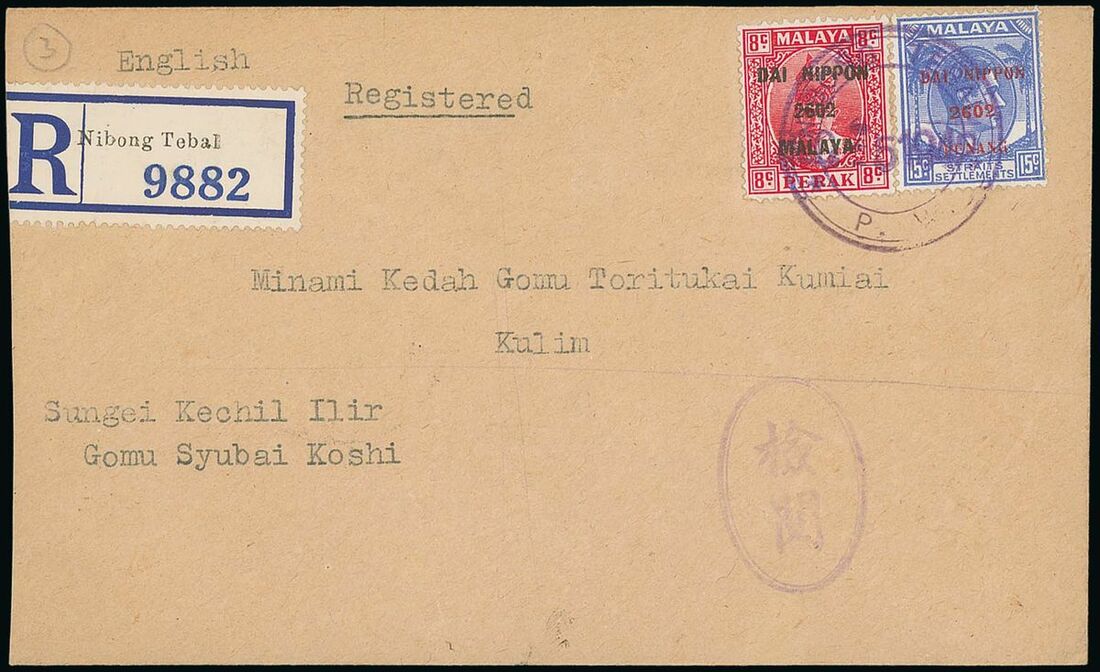 1942 (5 Dec.) envelope registered to Kulim, bearing Straits Settlements Dai Nippon Penang 15c. and Dai Nippon Perak 8c., both tied by