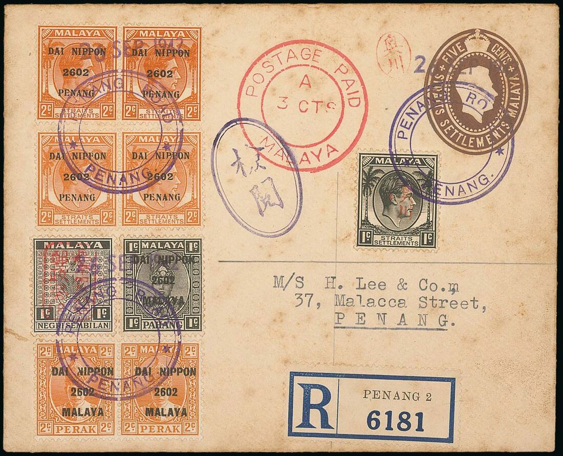 1942 (2 Sept.) Straits Settlements 5c. stationery envelope with Okugawa seal alongside, addressed to Penang, bearing Straits Settlements 1c. with Okugawa seal, Dai Nippon Penang 2c. pairs (2), Dai Nippon Pahang 1c. and Perak 2c. pair and Negri Sembilan 1c. with red single frame handstamp, all cancelled by superb