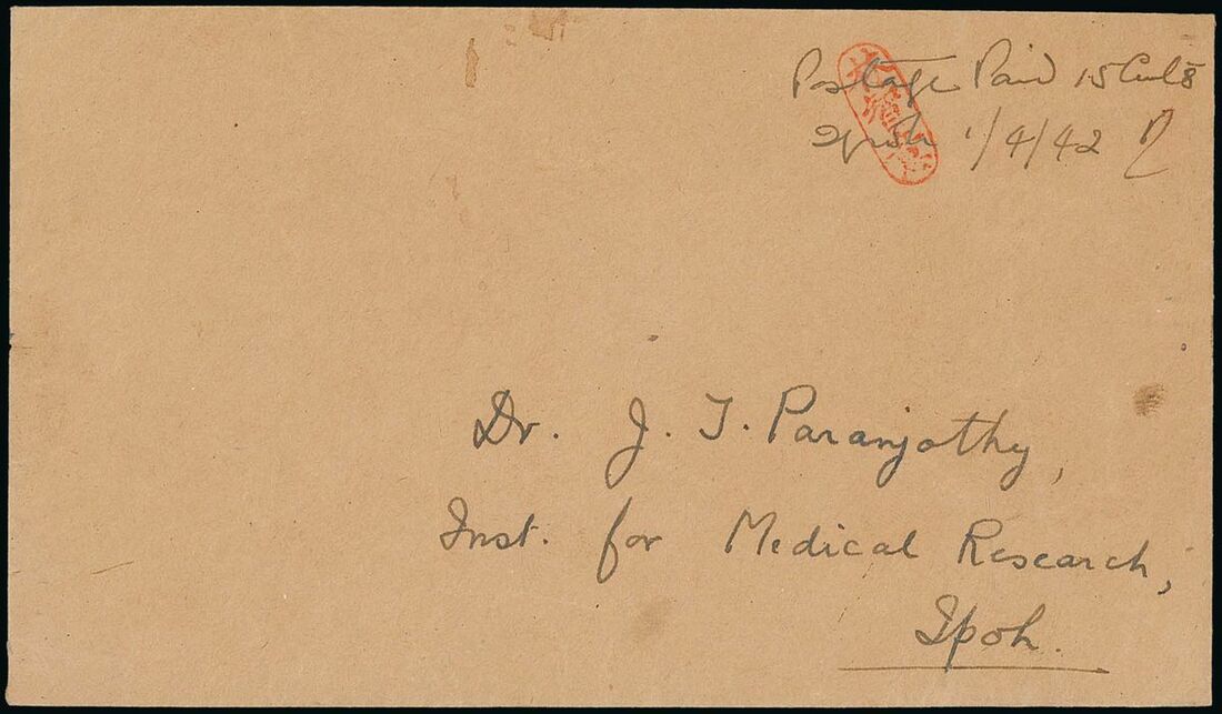 1942 (1 Apr.) locally addressed envelope showing manuscript "Postage Paid 15 Cents, Ipoh 1/4/42" with initials alongside and partly overstruck by small red chop. Photo