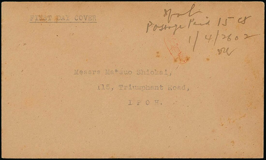 1942 (1 Apr.) locally addressed envelope showing manuscript "Ipoh, Postage Paid 15cts, 1/4/2602" with initials and small red chop alongside. Photo