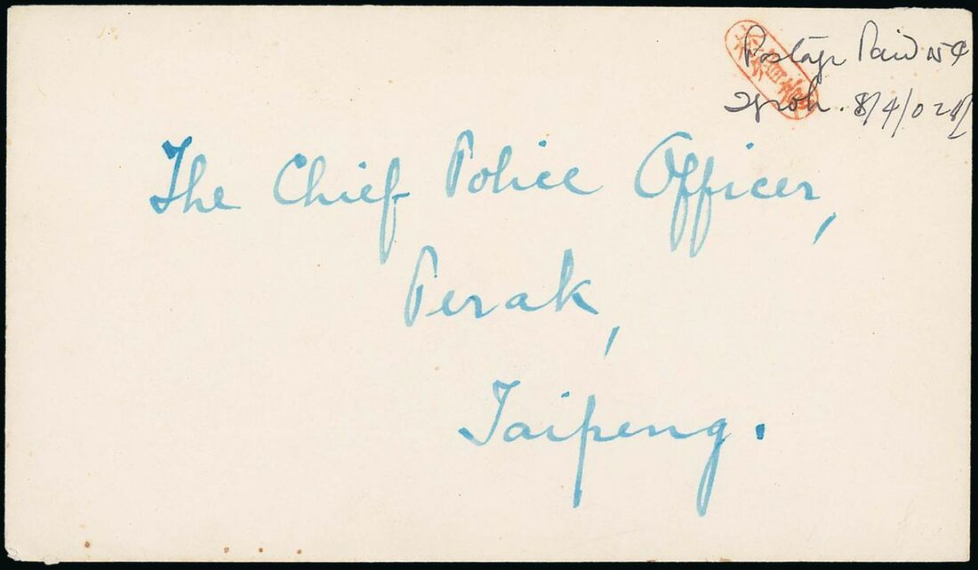 1942 (8 Apr.) envelope to Taiping showing manuscript "Postage Paid 15c, Ipoh. 8/4/02" with initials alongside and partly overstruck by small re chop, fine. Photo