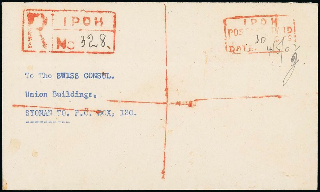 1942 (4 May) envelope registered Tanjong Tualang to Singapore showing good to fine strike of framed