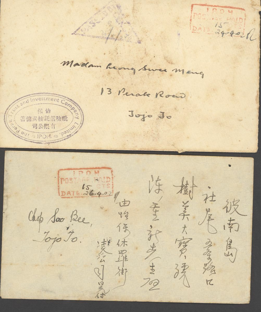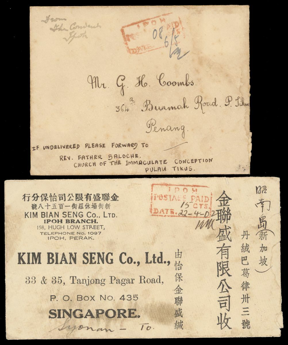 1942 (6 May - 26 May) commercial envelopes (4, all with faults) to Penang, Singapore and Tokyo (2), each showing framed