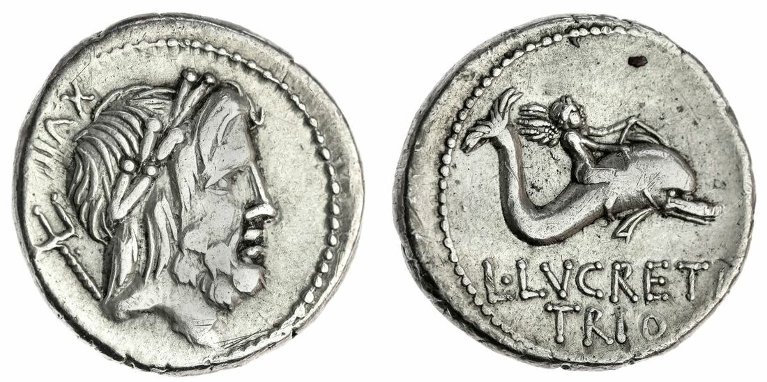 Roman Republic, L. Lucretius Trio, AR Denarius, 74BC, laureate head of Neptune right, trident and