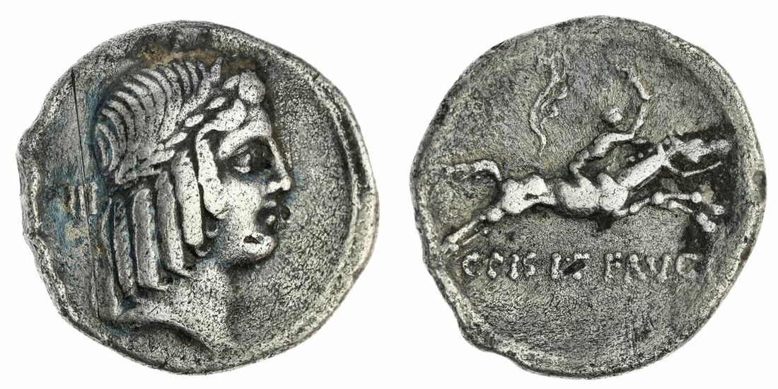 Roman Republic, L. Farsuleius Mensor and Faustus Cornelius Sulla, C. Calpurnius L.f. Frugi as moneyer AR Denarius, 67 BC, laureate head of Apollo right,