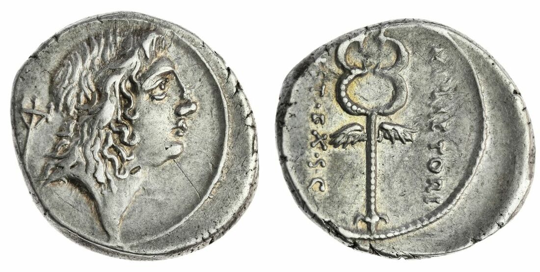 Roman Republic, M. Plaetorius M.f. Cestianus, AR Denarius, 57BC, Youthful male head right, trident behind rev.