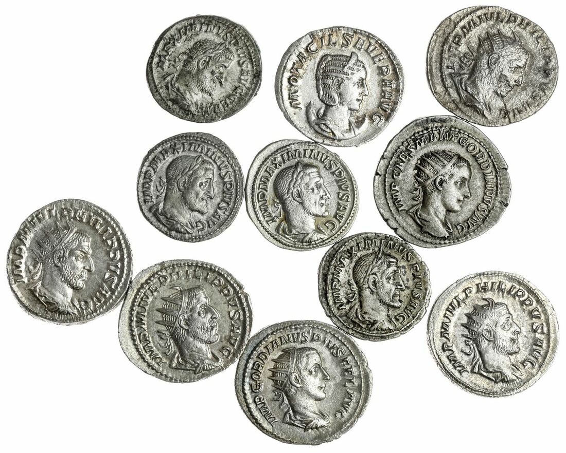 Roman Empire, A Selection of Denarii and Antoninianii (11): Maximinus I Thrax (AD 233-238) AR Denarius (4): i) Laureate, draped and cuirassed bust right, rev. Victoria advancing right, 2.81g, (RIC, 16) good fine; ii) another, as before, rev. Pax standing left holding an oliver branch, 3.35g, (RIC, 12) spotted, about fine; iii) another, as before, rev. Fides standing left, 3.35g, (RIC, 7a) Good very fine; iv) another, as before, rev. Providentia standing left, 3.39g, (RIC, 13) good fine, (4); Gordian (AD 238-244) AR Antoninianus, (2): v) Radiate, draped and cuirassed bust right, rev. Victoria standing left, 3.71g, (RIC, 156) Obverse near extremely fine, toned, reverse near very fine; vi) Another, as before, rev. Jupiter standing facing, 4.12g, (RIC, 2) good fine, well-struck but worn to reverse (2); Philip I, 'The Arab' (AD 244-249) AR Antoninianii (4): vii) Radiate, draped and cuirassed bust rev. Roma seated left holding Victory in right hand, 4.46g, (RIC, 44b) good very fine, well-struck; viii) Another, as before, rev. Annona standing left with patera and cornucopiae, 4.63g, (RIC, 28c) Good very fine, lustrous and detailed, slightly scratched; ix) Another, as before rev. Philip seated left in curule chair with sceptre and globe, 4.49g, (RIC, 2b) slight crack to edge of flan but about extremely fine; x) One more, as before rev. Securitas seated left, 3.89g, (RIC, 48b) Good fine (4); xi) Otacilia Severa, (AD 244-249) AR Antoninianus, Draped bust right, rev. Concordia seated left, 3.56g, (RIC, 125c) cleaned, nevertheless very fine; (11). Sold as described, no returns.