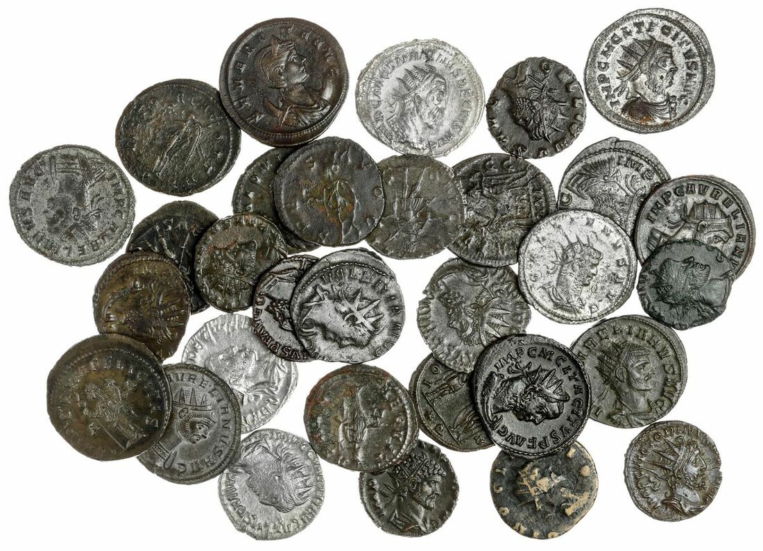 Roman Empire a Selection of Third-Century Antoninanii (31): All with obverse of radiate, draped and cuirassed bust, unless otherwise stated: i) Herennius Etruscus as Caesar (249-251) struck under Trajan II Decius, SPES PVBLICA Spes advancing to left, holding flower in right hand and raising skirt with left, 4.38g, (RIC, 149) Cleaned, well-struck but die-wear to reverse, very fine; ii) Trebonianus Gallus (251-253) Juno seated to left, holding corn-ears and sceptre, 3.97g, (RIC, 83) cleaned, good very fine; iii) Trajan II Decius (249-251) VICT - ORIA AV - G Victory advancing l. holding wreath and palm, 4.40g, (RIC, 29c) tooled, slightly grainy but about good fine; iv) Valerian I (253-260) DEO VOLKANO Vulcan standing facing within tetrastyle temple, head to left, holding hammer in his right hand and tongs in his left, 3.12g, (RIC, 5) worn and slightly flattened, bright, about fine; v) Gallienus (253-268) VICTORIA AVG Victoria advancing left, holding wreath in her right hand and palm frond in her left; in field to left, (RIC, 663) lightly marked but otherwise good very fine, attractive; Claudius II Gothicus (268-270) (2): vi) Aequitas standing left with scales and cornucopiae, 3.80g, (RIC Online, 137) obverse extremely fine with beautiful toning, reverse flattened but fine, rare; vii) AE, struck under Aurelian,