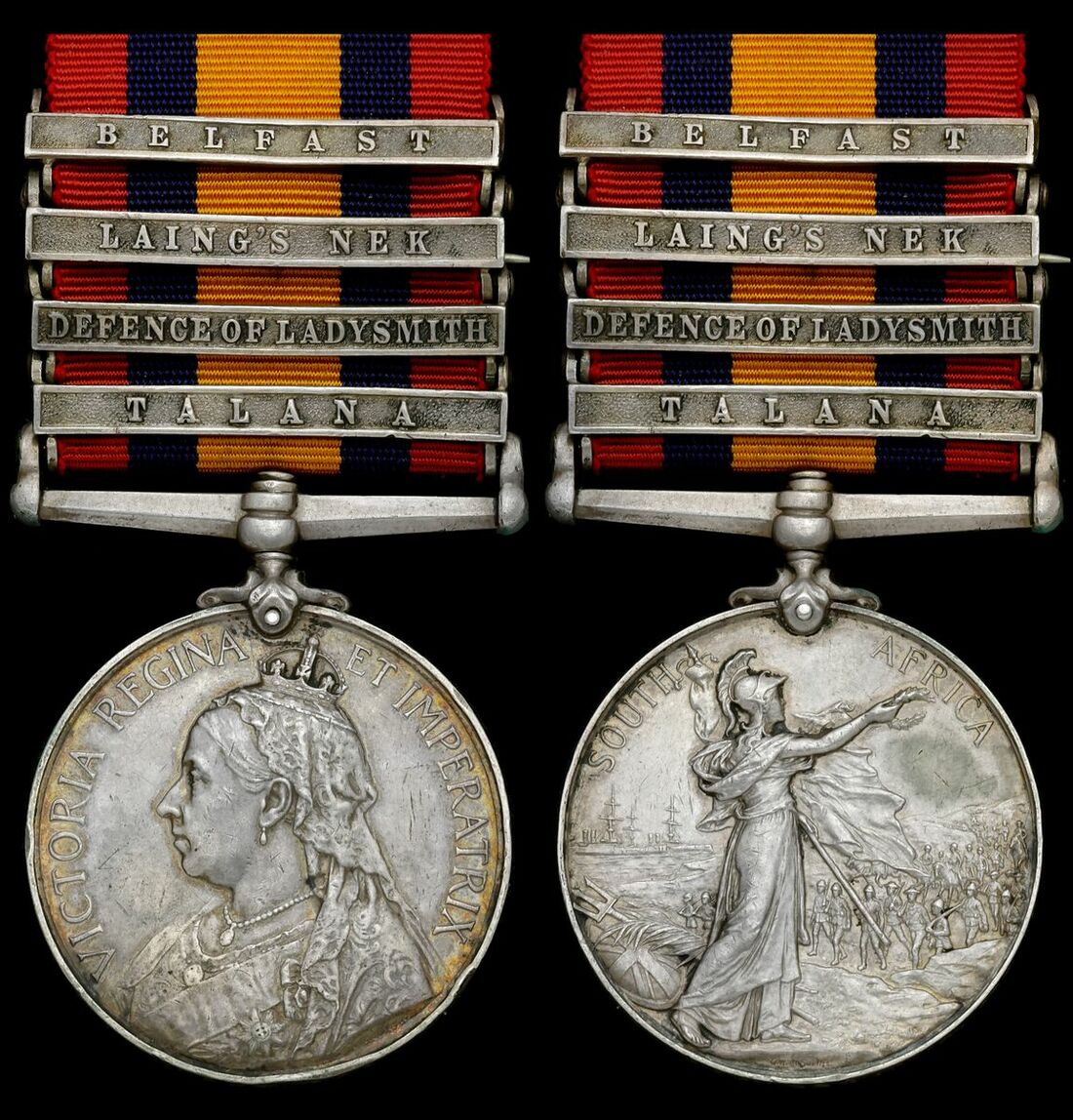 Queen’s South Africa 1899-1902, 4 clasps, Talana, Defence of Ladysmith, Laing’s Nek, Belfast (5066 Pte. W. Underwood, 1: Leic: Regt.), retaining pin affixed to backstrap of Laing’s Nek clasp, edge bruising and contact marks, nearly very fine