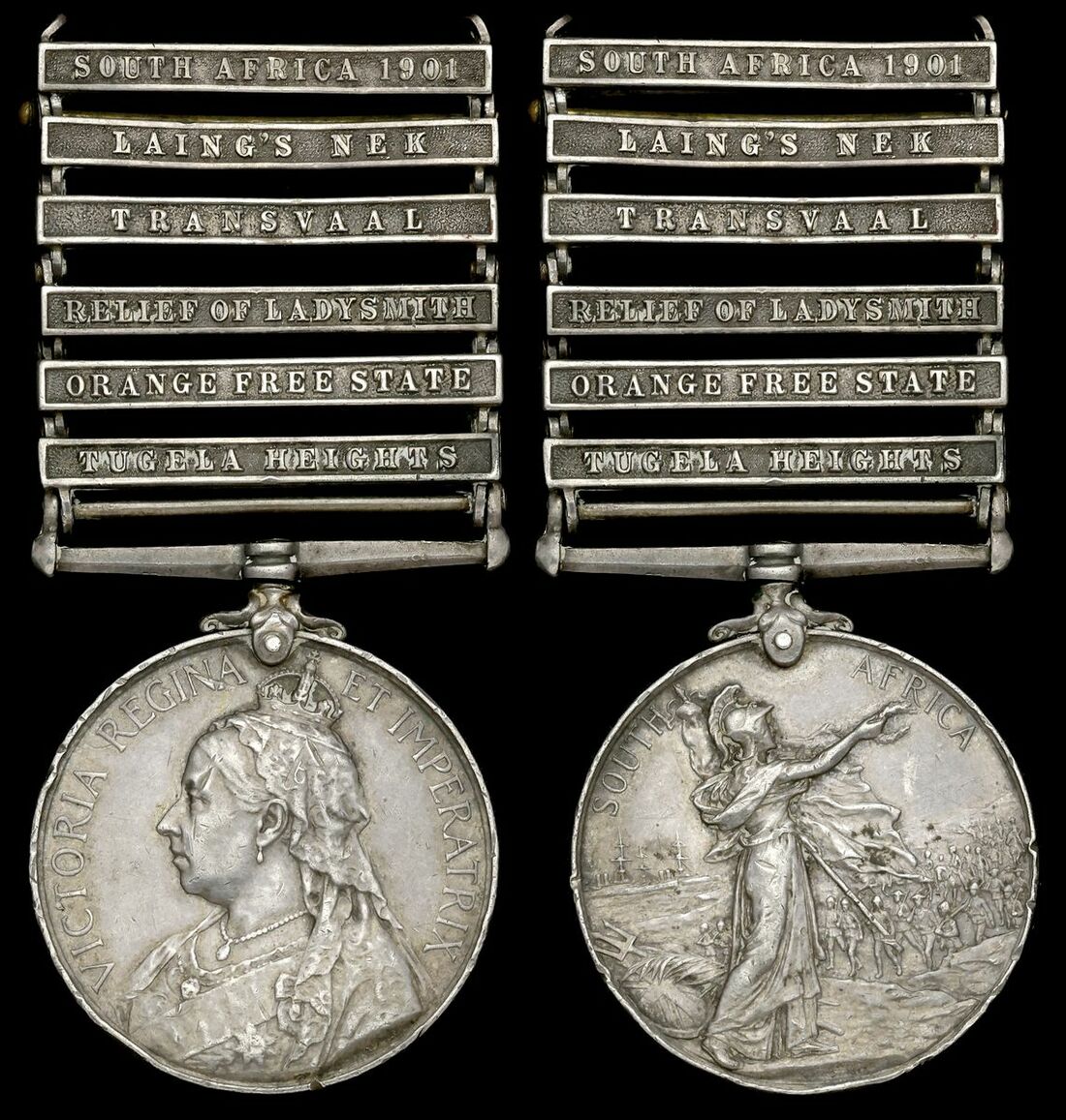 (x) Queen's South Africa 1899-1902, 6 clasps, Tugela Heights, Orange Free State, Relief of Ladysmith, Transvaal, Laing's Nek, South Africa 1902 (4885 Dmr: T. Pickup, R: Lanc: Regt.), unofficial rivets, heavy contact marks, nearly very fine
