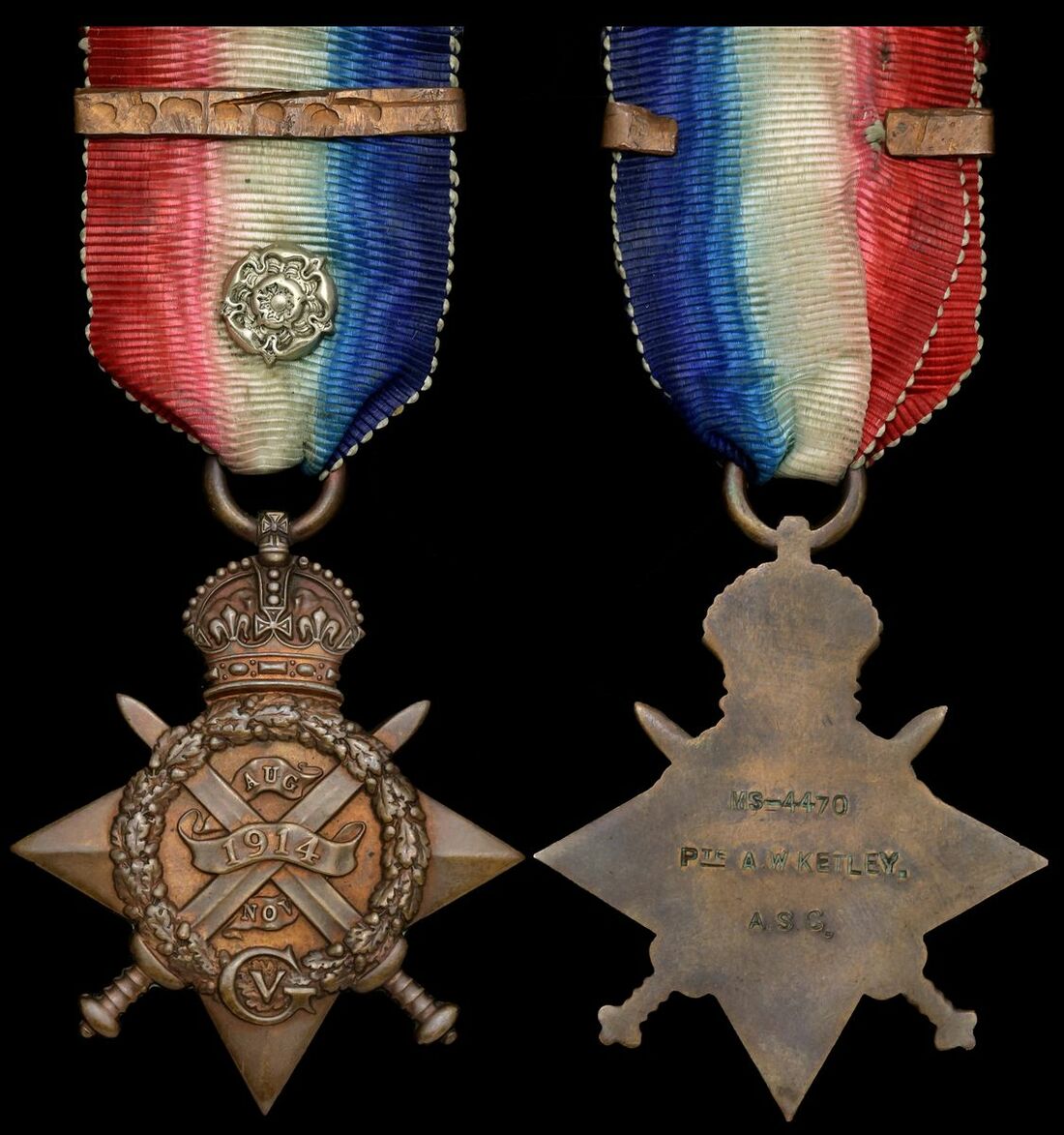 1914 Star, with rosette and slide bar on riband (MS-4470 Pte A. W. Ketley. A.S.C.) good very fine