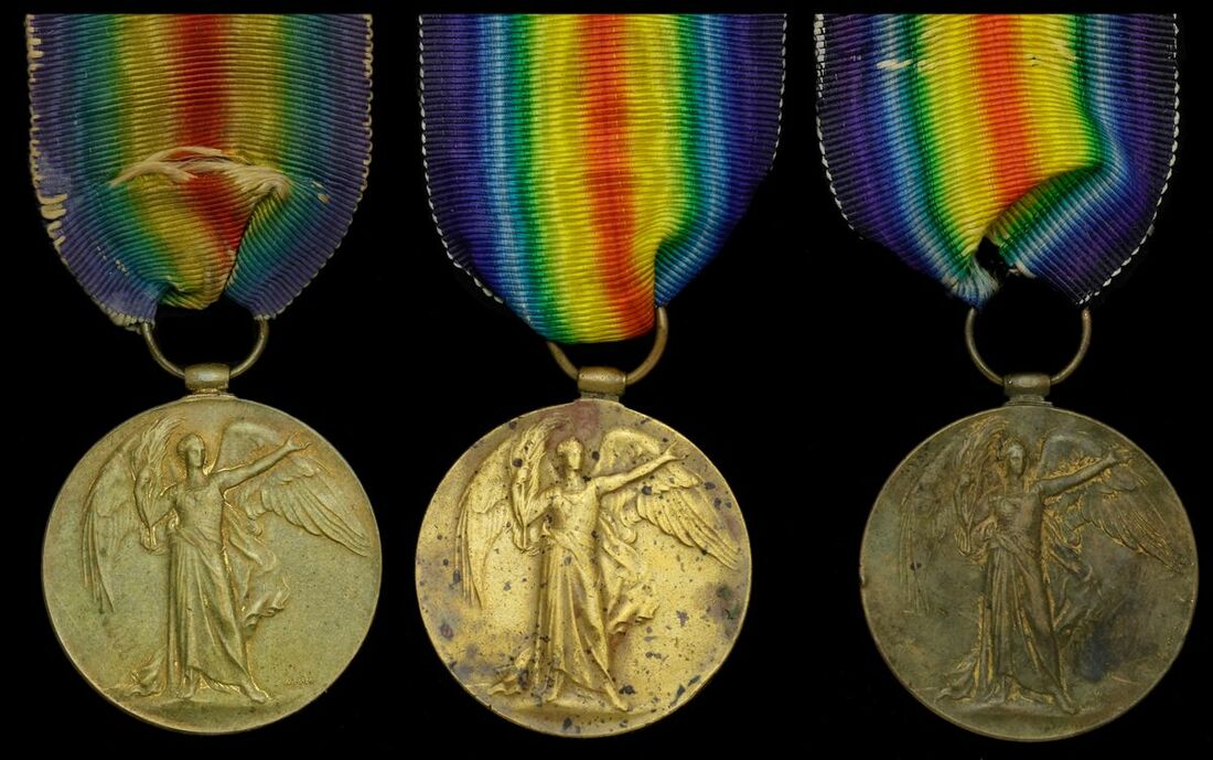 Victory Medal 1914-19 (3) (50508 Pte. W. Preston. Manch. R.), (M2-268680 A. Cpl. C. V. Hicks.), (25048 Pte. J. Davis. Oxf. & Bucks. L. I.), contact marks and edge wear, overall very fine