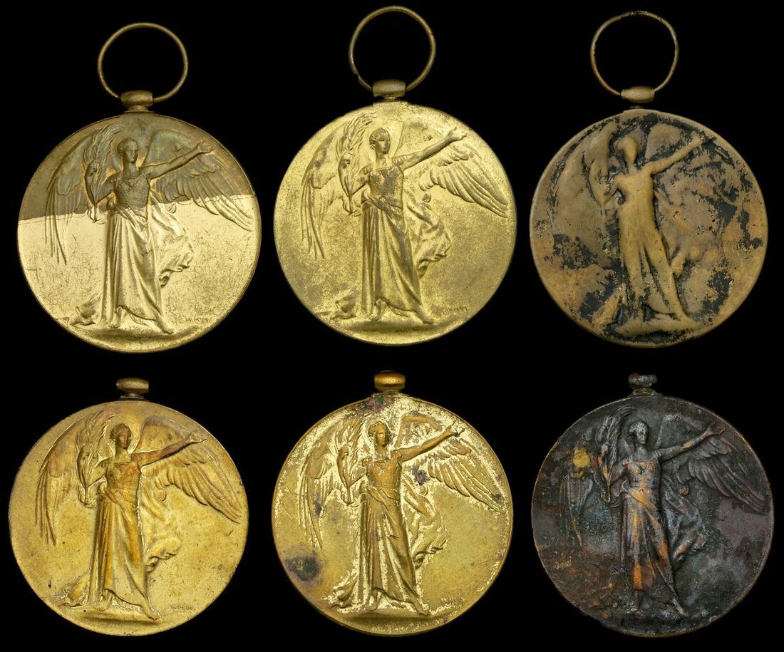 Victory Medal 1914-19 (76...06 Pte E. S...k 7-Can. Inf.; 30275 Pte. G. W. Bashford. R. W. Fus.; 36462 Pte. J. Smith. Y & L. R.; 723 Cpl D, D. Neale. Monmouth. R.; ...Pte A. E. ...head R. Berks. R.; 63086 Pte. H. Collins. Suff. R.), the third polished, the fourth to the sixth discs only with the last heavily tarnished (6)