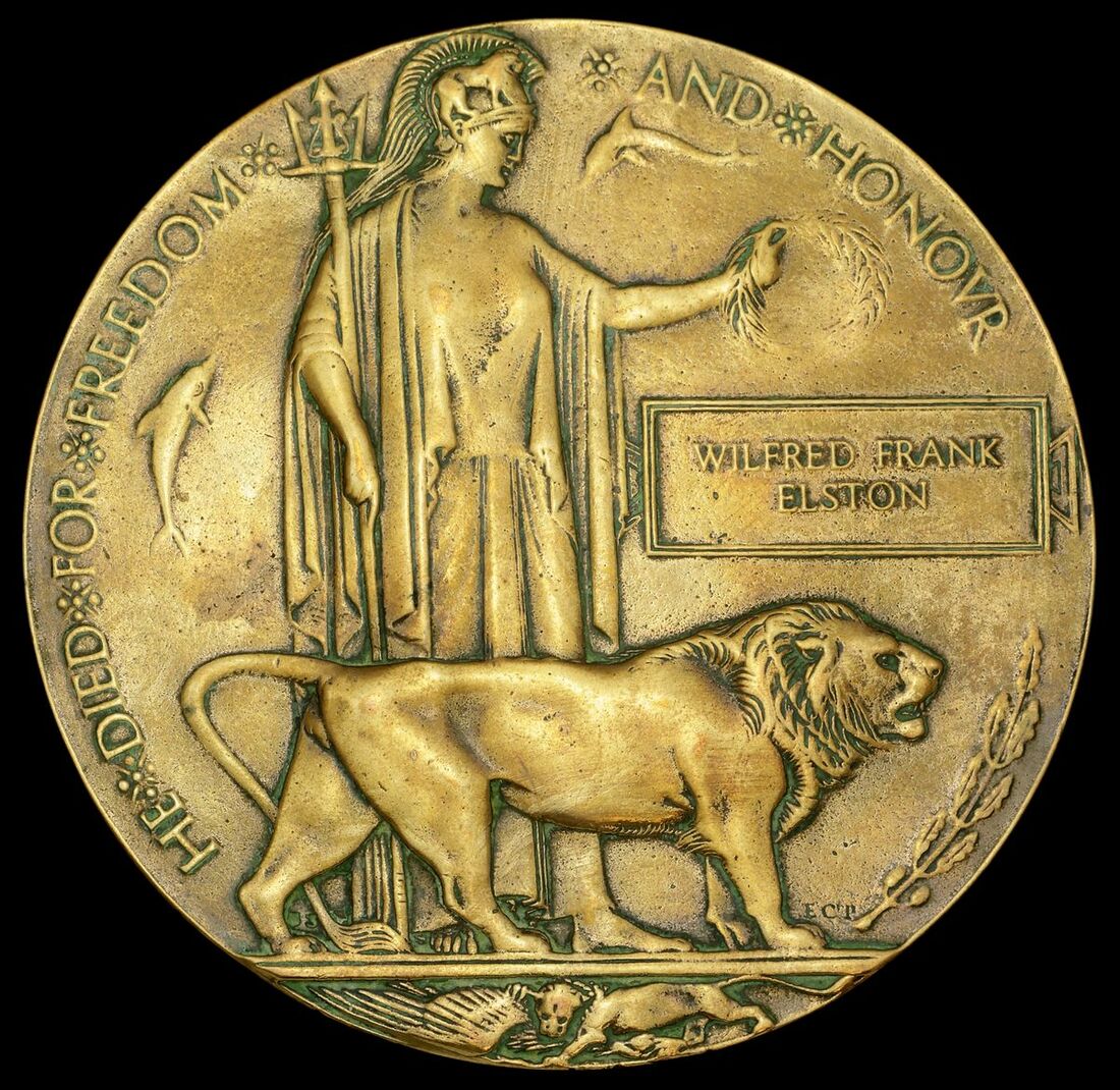 The uniquely named Great War Bronze Memorial Plaque awarded to Private W. F. Elston, 6th (Pioneer) Battalion, South Wales Borderers who was killed in action at the Lys River on 9 April 1918
